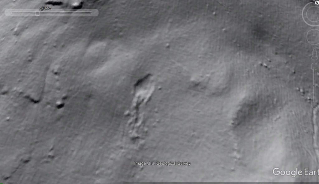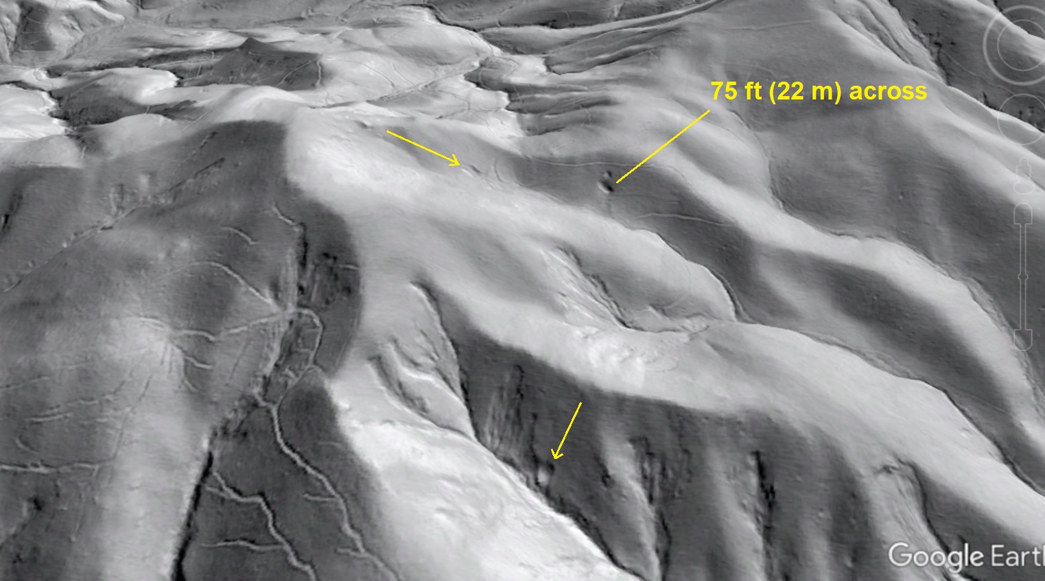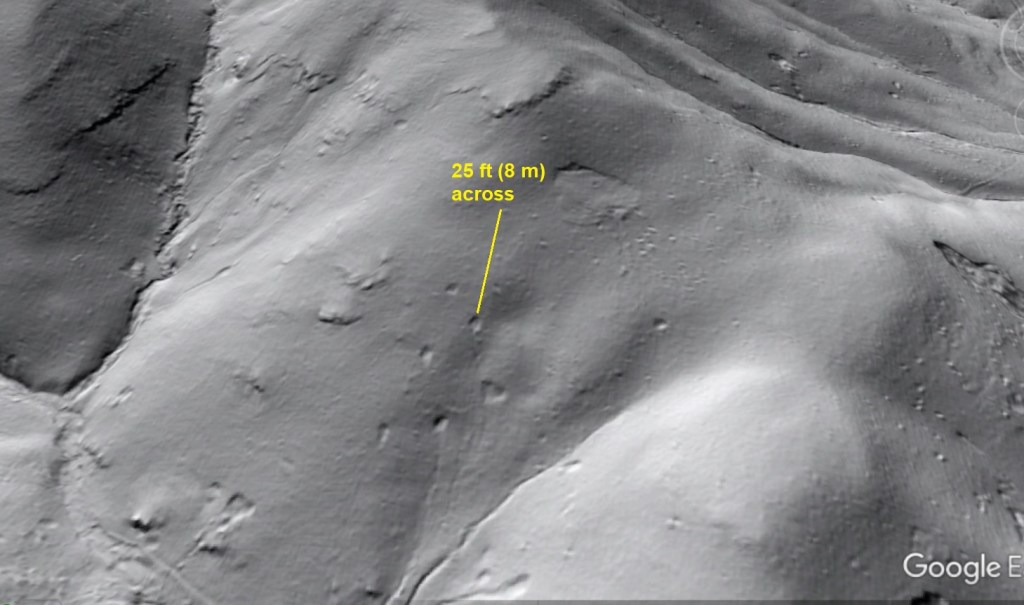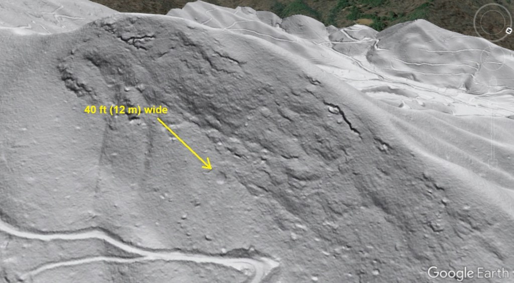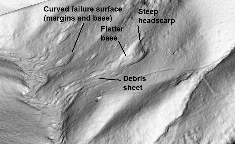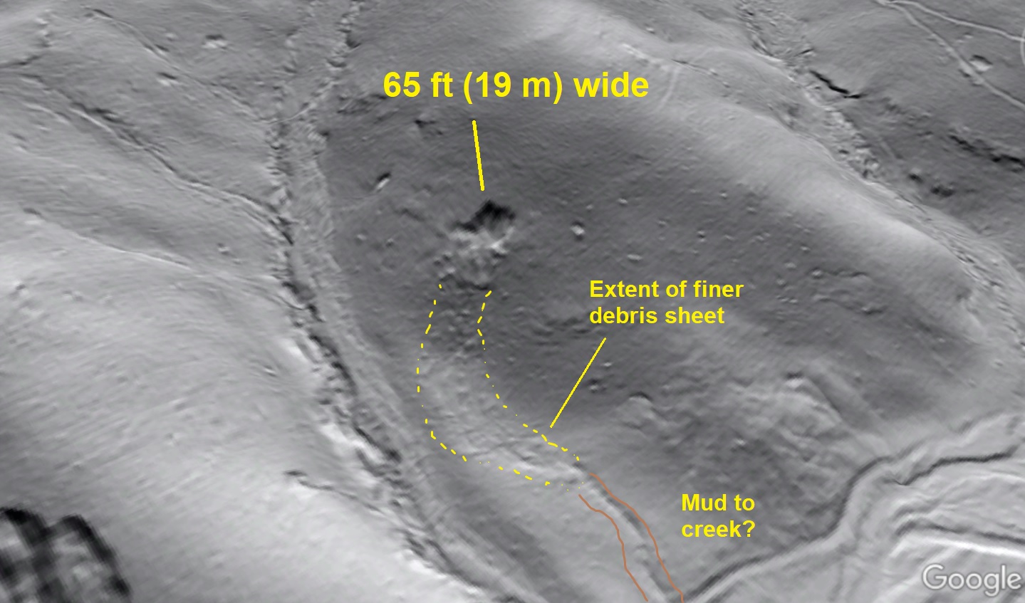 So, did water actually gush up out of the ground and blow this material out, as the “blowout” name implies? In the case of the feature above, definitely not. Water would certainly have played a role in this slide’s failure, but only in the tiny spaces between soil and rock particles. There, it reduced interparticle friction and significantly weakened the soil–there was not a “broken water main” inside the slope. The slide shown above would, however, have appeared to burst or erupt out of the hillside, and probably quite quickly, with the sliding material rapidly turning into a fluid and cascading down the slope due to its extreme saturation. A look at some of the details of the slide scar’s shape explains this style of movement.