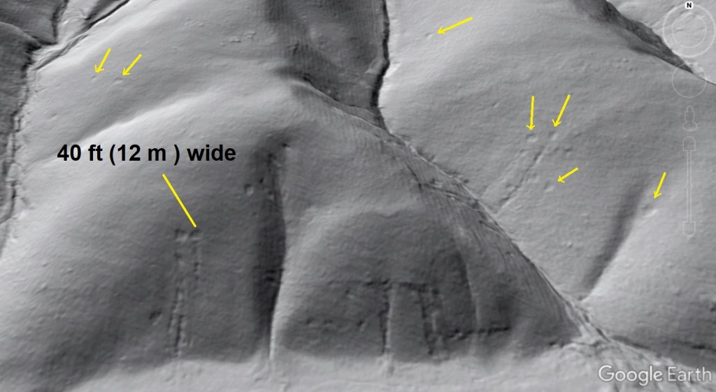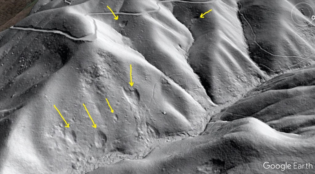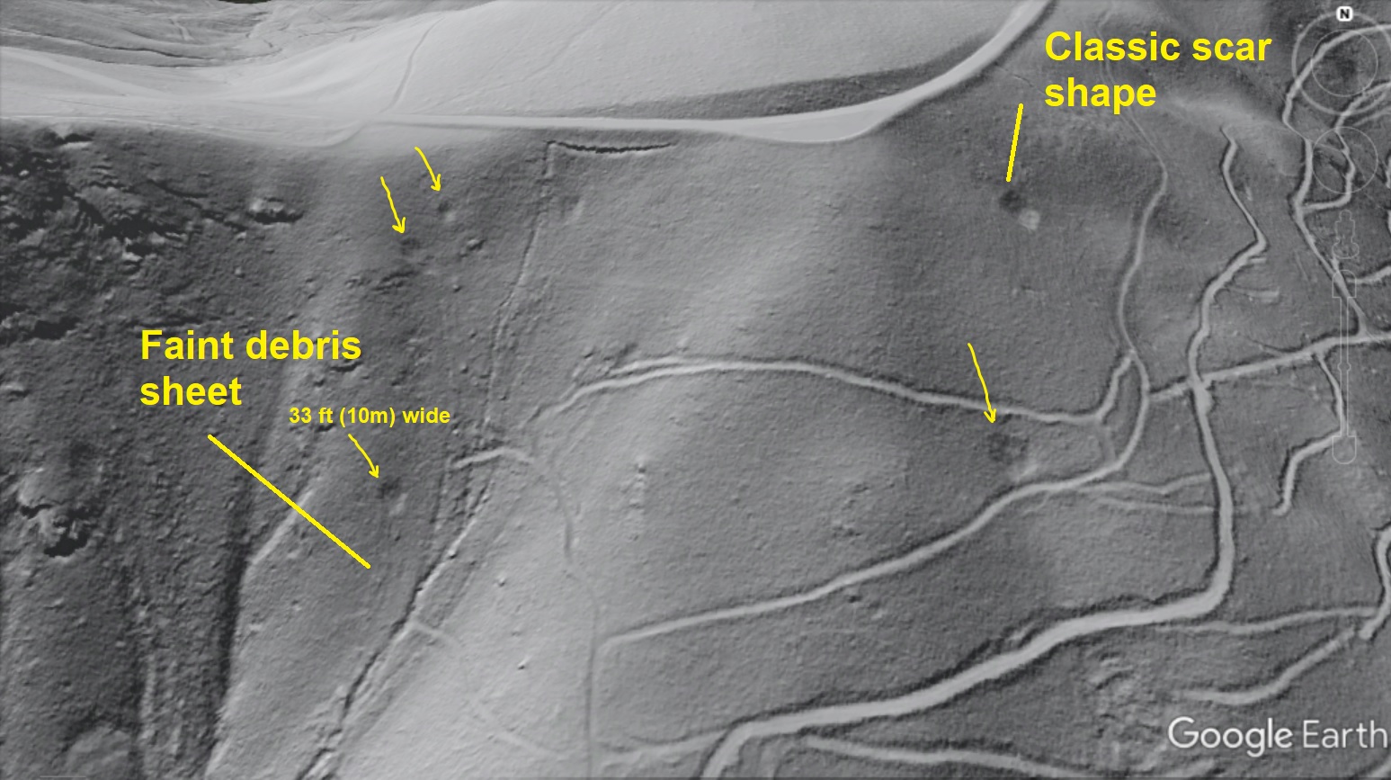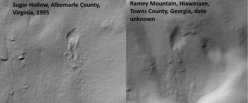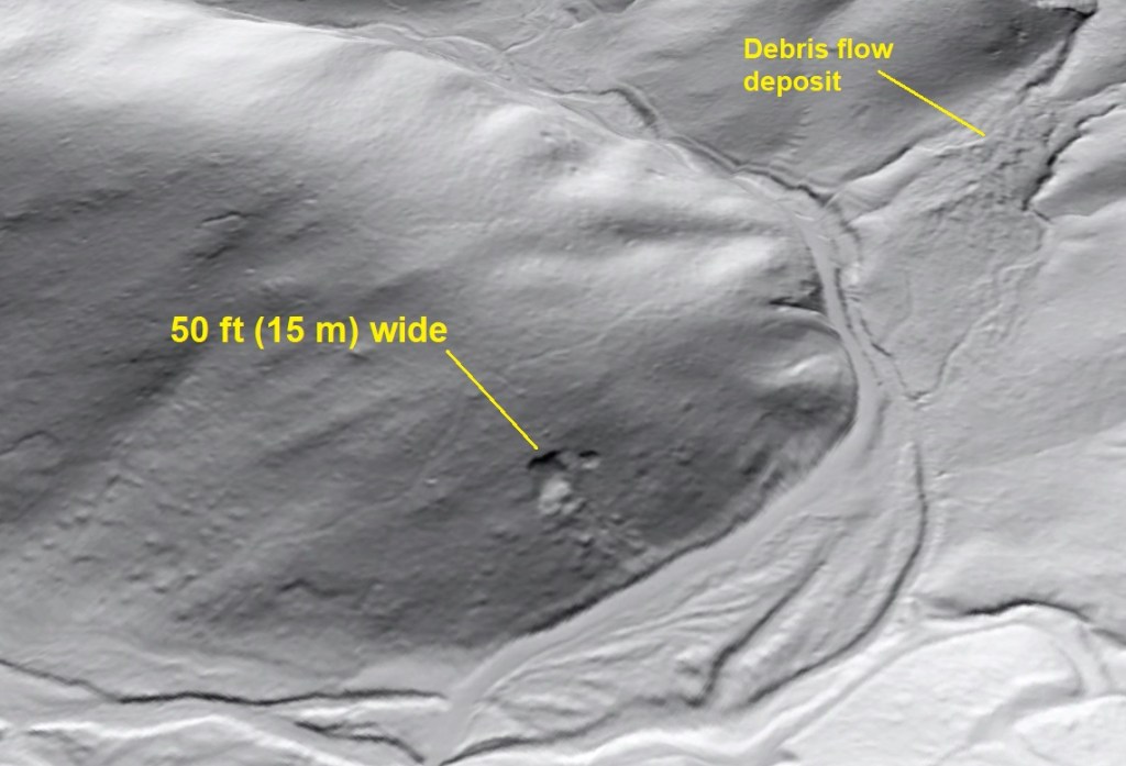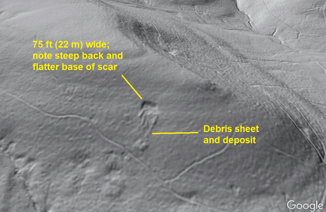 “Blowout” is definitely an unusual name for a type of landslide, and even the guy who came up with the name (William Eisenlohr, Jr., in 1952; link here) didn’t seem to like it. The purpose of the name was to capture the apparent type of movement associated with these slides, which eyewitnesses described as water and soil “bursting forth” from the ground during a 1942 storm which delivered over 20 inches (>500 cm) of rain within just a few hours. The lidar image below shows one such slide, and the scar (“hole”) and trails of debris leading downslope seem to fit nicely with this suggested style of movement.
