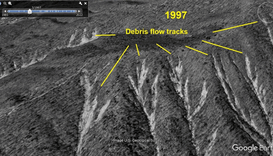 While blowout-style slides are clearly less destructive to slopes than erosive debris flows, you still wouldn’t want to be below one when it happened. Many of the Appalachian examples mobilize large boulders within the debris sheet. Finer material, consisting of cobble-size rock fragments and soil, travels well beyond the boulders, as is visible in the Sugar Hollow, Virginia, image below. This sort of event would still be destructive if it occurred upslope of, and within reach of, buildings or infrastructure.