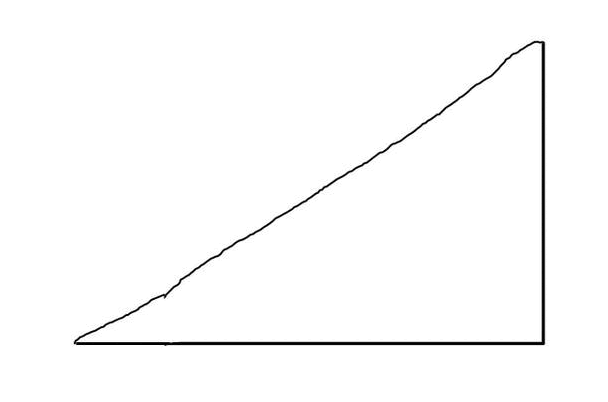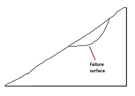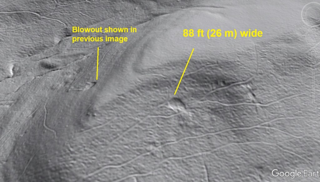 A specific detail of all of the blowout-style features highlighted in the previous post (link here) is the shape of their failure surface–it is curved, being much steeper on its upslope side and much flatter on the downslope side. The simple cross section sketch shown below illustrates this shape.
