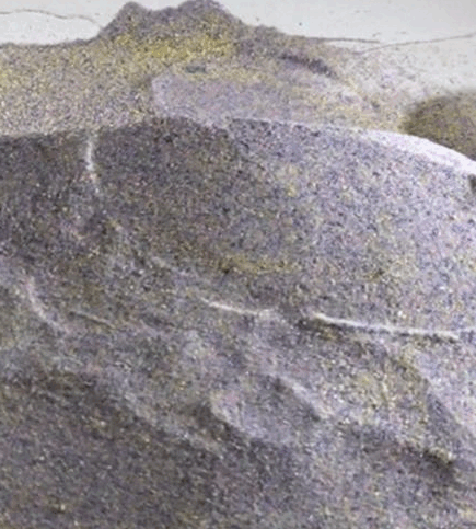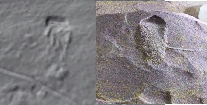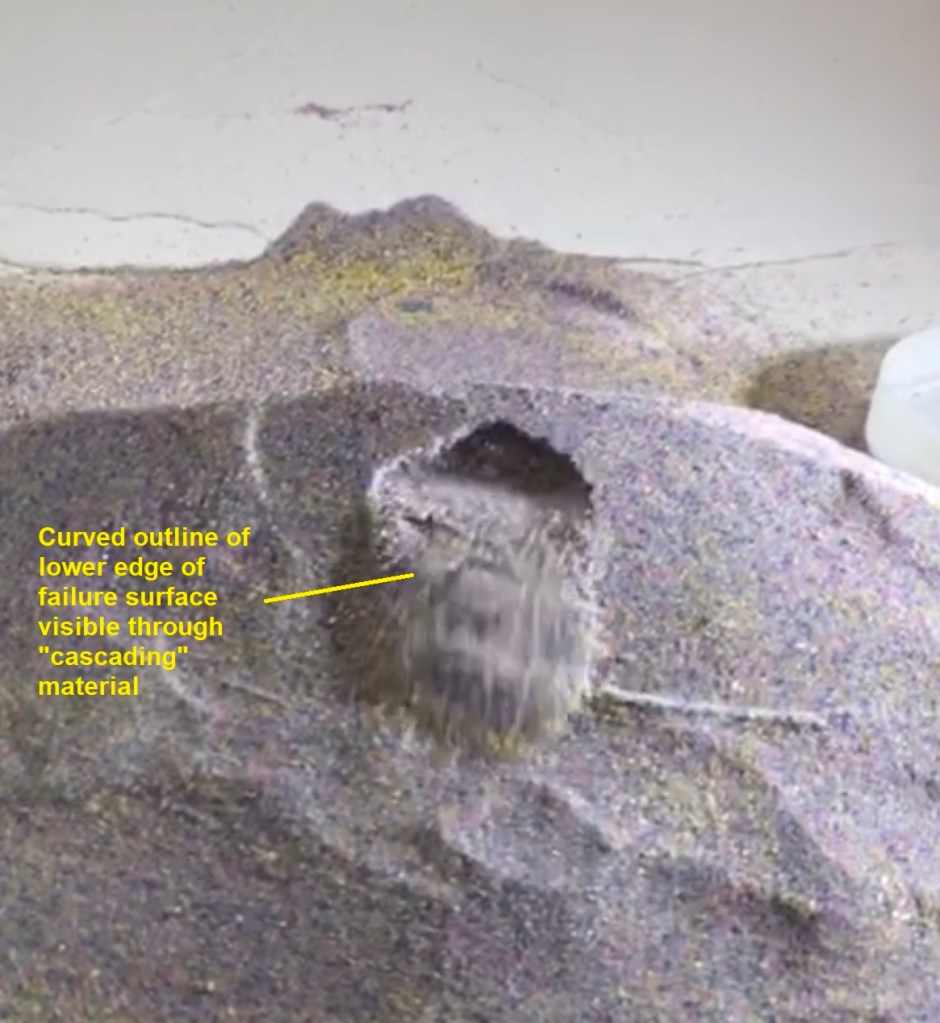 If an observer viewed this process from below, with line of sight generally parallel to the intact slope, the impression would absolutely be of outward, and possibly even upward, movement by the downslope end of the slide mass. I am a big fan of physical models, and some aspects of the blowout movement process can be captured using sandblast beads with a low-friction coating buried within stronger granular material. The beads are designed to flow from a container into a sandblasting device, so they provide a way of hinting at the weak behavior of the saturated soil. The model shown below is photographed straight-on, but the shadow produced at the toe of the soon-to-be blowout shows that it projects upward and outward from the intact slope. This will make more sense when you get to the GIF a couple images down…