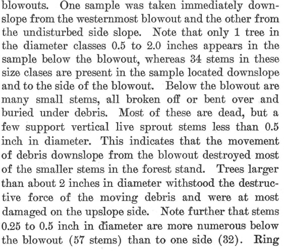 This GIF might, to some degree, channel Hack and Goodlett’s thinking as they surveyed results of the 1949 Shenandoah Flood 6 years after the event had occurred. The non-destructiveness of the blowouts to the forest soil downslope was a point of considerable interest to them, with their report noting that only sapling trees smaller than 2 inches (5.1 cm) in diameter were knocked down by the blowout debris. Notably, the broken saplings weren’t pulled out the ground, emphasizing just how intact the land surface remained. Most of the blowouts they surveyed were 50 feet (15 m) wide, so a considerable amount of material moved over the slope without causing substantial damage.