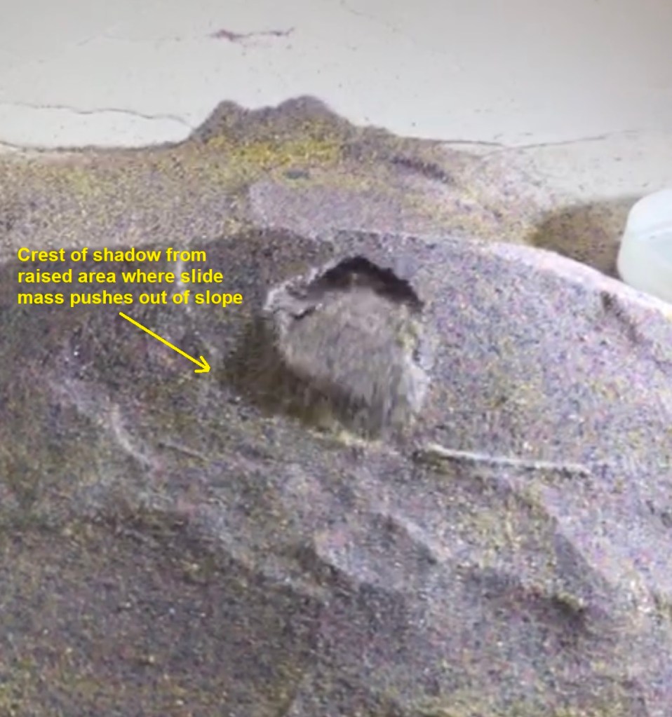 The weak material in this little model needs to be much weaker–this is the best that dry materials will do. Even so, the general idea–and visual impression– of an apparent burst of material out of the scar on the slope is communicated. The mass of moving material does not remain intact, and approaches a flow-like movement before rapidly losing momentum. Details like the thin trails of debris leading from the edge of the failure scar are commonly observed on the real failures.