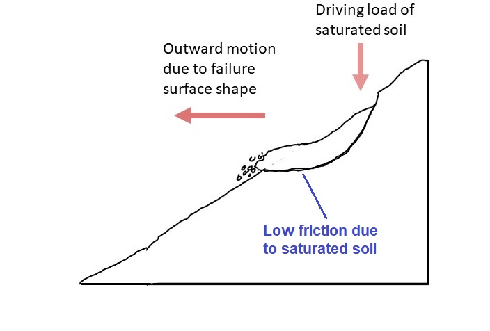 The intact, non-sliding hillside is much steeper than the downslope portion of the failure surface, so material moving along the failure surface would actually move outward from the failed area before gravity took over, requiring the slide material to collapse back down to the slope. Many of the blowouts have tall, steep headscarps (upper portion of failure surface), which would provide considerable driving load to push material out of the failed area. Once clear of the failure surface, the sliding material presumably quickly broke apart and fluidized, giving the impression of wet material “blowing out” from the hillside flowing over the slope.