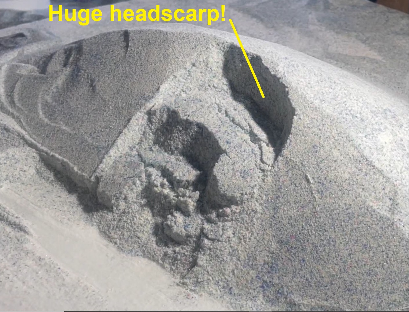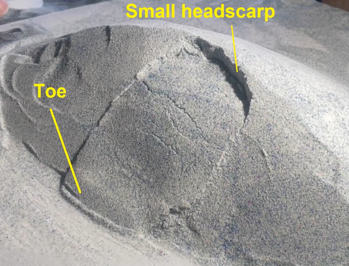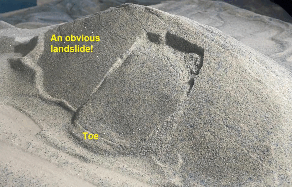 The two images below show the same model landslide at different points during its evolution. The lower image, of course, looks much uglier, with a broken-up slide block and huge, looming headscarp. Notably, the thick toe labeled in the upper image is conspicuously missing…(spoiler: you can watch this model evolve at 1:04 in the video link at the end).