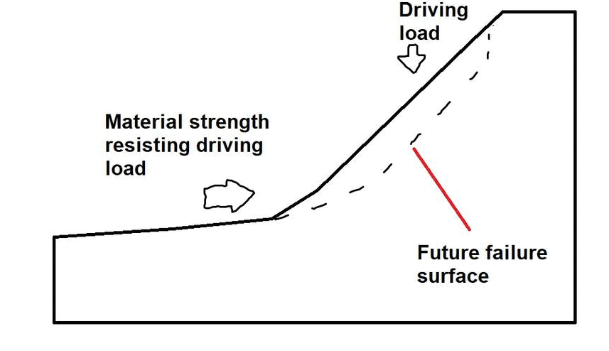 So, how did the slide progress from a not-too-impressive feature to a mangled mess? The answer relates to that toe, or rather its absence in the lower image, with a few details of the slide’s shape thrown in (more on that in a bit). Toe removal, however, is the main idea, and removing a landslide’s toe invites trouble in the form of probable continued movement. A slide like the one shown above (that is, not a rapid, flow-type slide) can move until the toe becomes large enough to resist the driving load that led to slide movement, assuming that friction on the sliding surface remains low. Removing the toe allows driving load to overwhelm resistance again if friction on the slide plane is sufficiently low, leading to renewed movement of the slide. The GIF below illustrates this idea in basic terms. I-26 drivers in western North Carolina might appreciate the pink excavator…