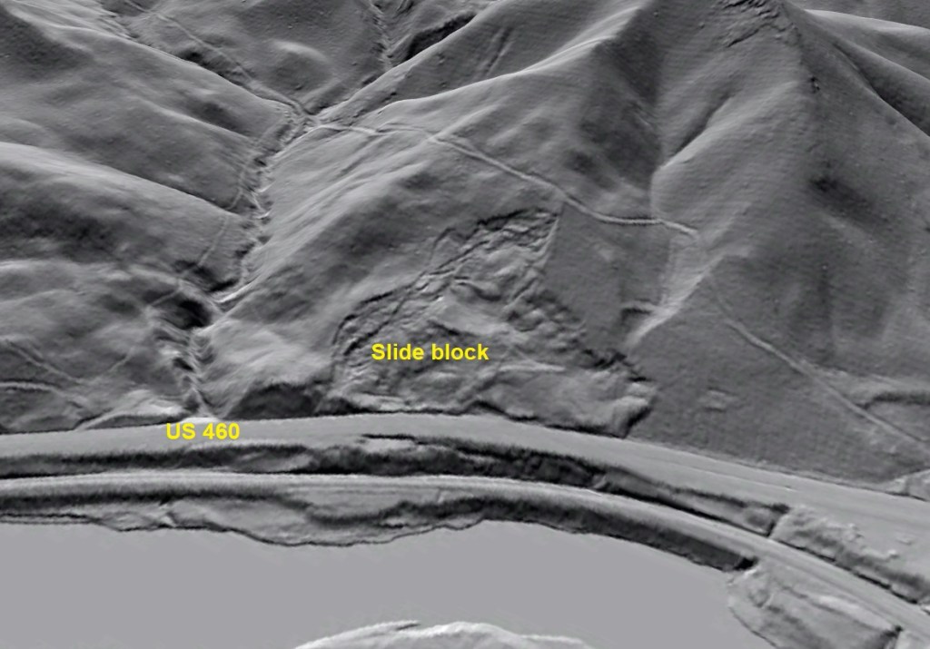 Destabilization of landslides by toe removal is a very real thing, with actual scenarios–both large and small–arising from construction and natural stream or wave erosion. Many are slow and manageable, but they can be ongoing, hard to stop, and quite expensive over time. A famous example I am fond of is shown below. This is the “Galloping Highway” slide in Giles County, Virginia, along US 460. The toe of an older, dormant slide was removed for the highway cut, initiating literally decades of reactivated–and slowly ongoing–movement. This slide is, in effect, a real-world example of the previous GIF where an “invisible” slide came back to life. The slide block is nearly 1,000 feet across along US 460.