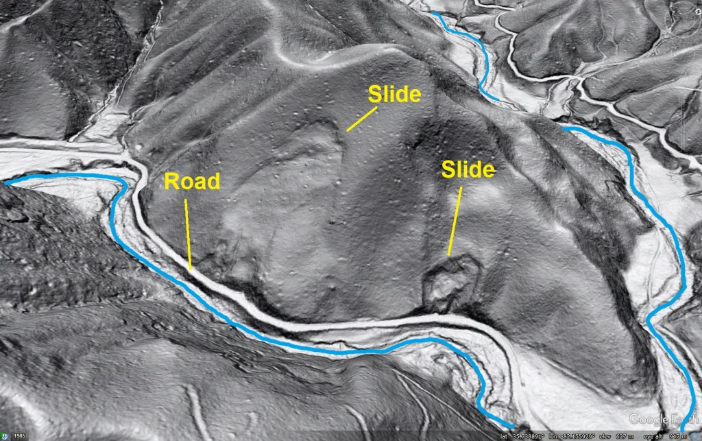 The slides shown below are in McDowell County, North Carolina. Both are situated for possible reactivation due to the road cut that has impacted their toes as well as steady stream erosion of the toes, which would pre-date the road cut. I imagine both have a reactivation history due to stream erosion; the smaller slide on the right appears to have reactivated more recently due to the road cut.