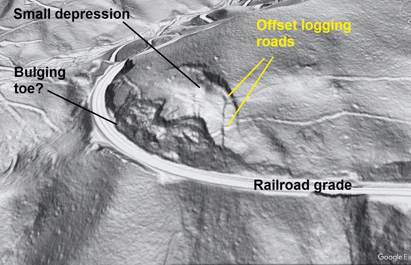 The next impressive example is along a railroad grade in western North Carolina. Lumpy areas just above the tracks look very much like recent reactivation, and a faint toe seems to be pushing out of the base of the cut. Two logging roads at the right of the slide are offset by scarps, indicating recent slide movement. The relative impact of the railroad cut and possible removal of material from the slide toe as it slowly pushes outward can’t be discerned from lidar, but the offset roads and ugly toe indicate this one definitely deserves engineering attention.