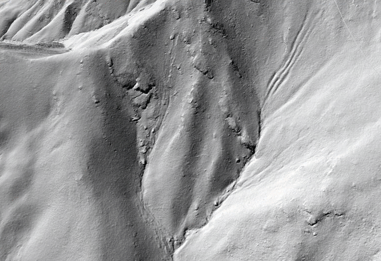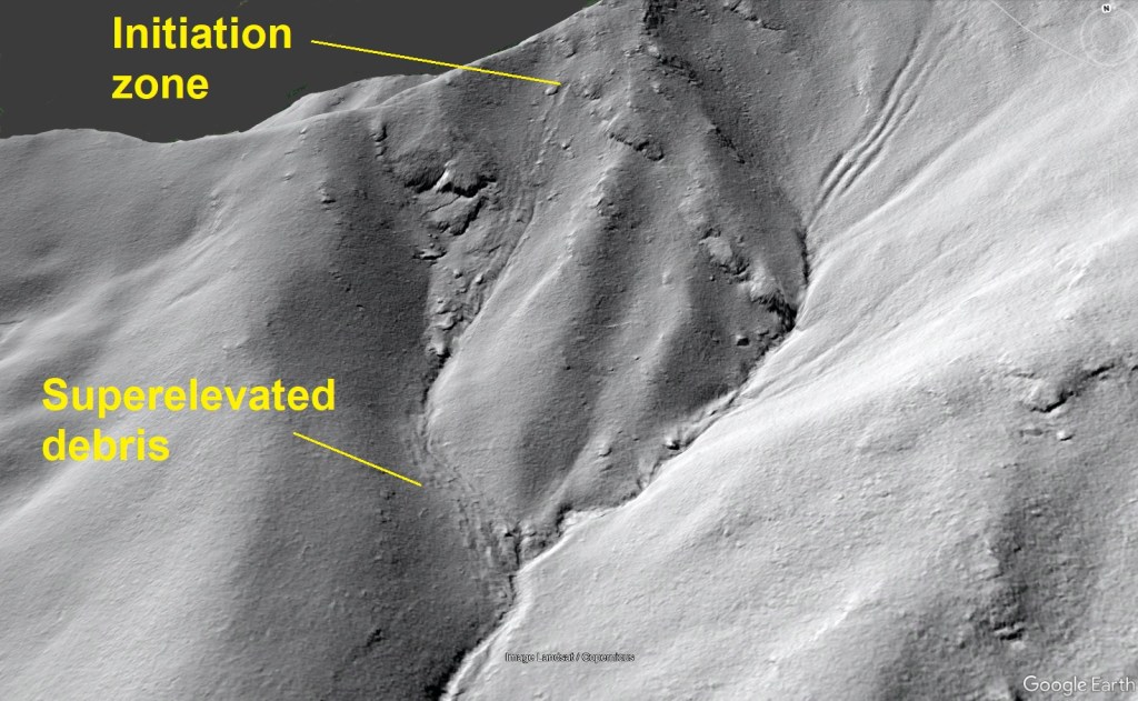 This debris flow has a less impressive scar/initiation zone, but the flow did leave traces of a process known as “superelevation,” which describes a flow sloshing up the sides of bends in the channel carrying it due to its momentum.
