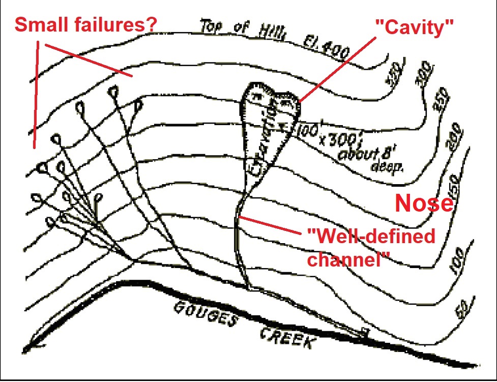 A 2023 geologist of the Google Earth and drone era has to remember that Myers drew his 1901 or 1902 map sketch by interpreting from the ground, and he was quite successful in capturing the general layout of the landscape around the debris flow. No indication of his vantage point for making his sketch is given in the drawing of the text excerpt; he may have been along Gouges Creek or viewing from the ridge to the south. The images below compare the actual topography to Myers’ sketch, with labels on notable features. The light blue lines in the LiDAR image indicate faint channels with may generally locate the many small failure Myers illustrated. No significant trace of these failures is visible in today’s landscape.