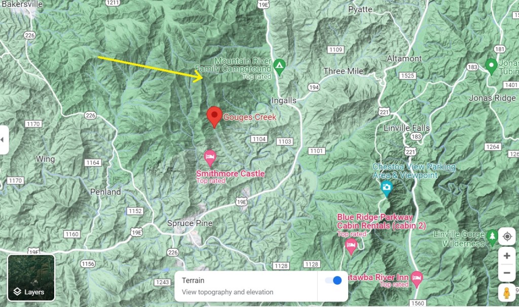I thought it would be interesting to try to find this debris flow based on the information Myers provides. With the sketch and text, Myers indicates that the debris flow entered Gouges Creek from a downstream-left direction, left a “heart-shaped” scar on the hillside, and was near a ridgeline and summit and generally very high within the surrounding landscape. In the era of high-resolution LiDAR imagery, these details turned out to be sufficient to locate the debris flow on the Mitchell County-Avery County line north of Spruce Pine, North Carolina. A LiDAR hillshade image of the slide, as well as a Google Maps image of its location, are shown below. The slide is not large in the context of the entire mountainside, but the heart-shaped scar from the initial failure (end of yellow arrow), downslope scouring, and proximity to the ridgecrest/summit are clearly visible.