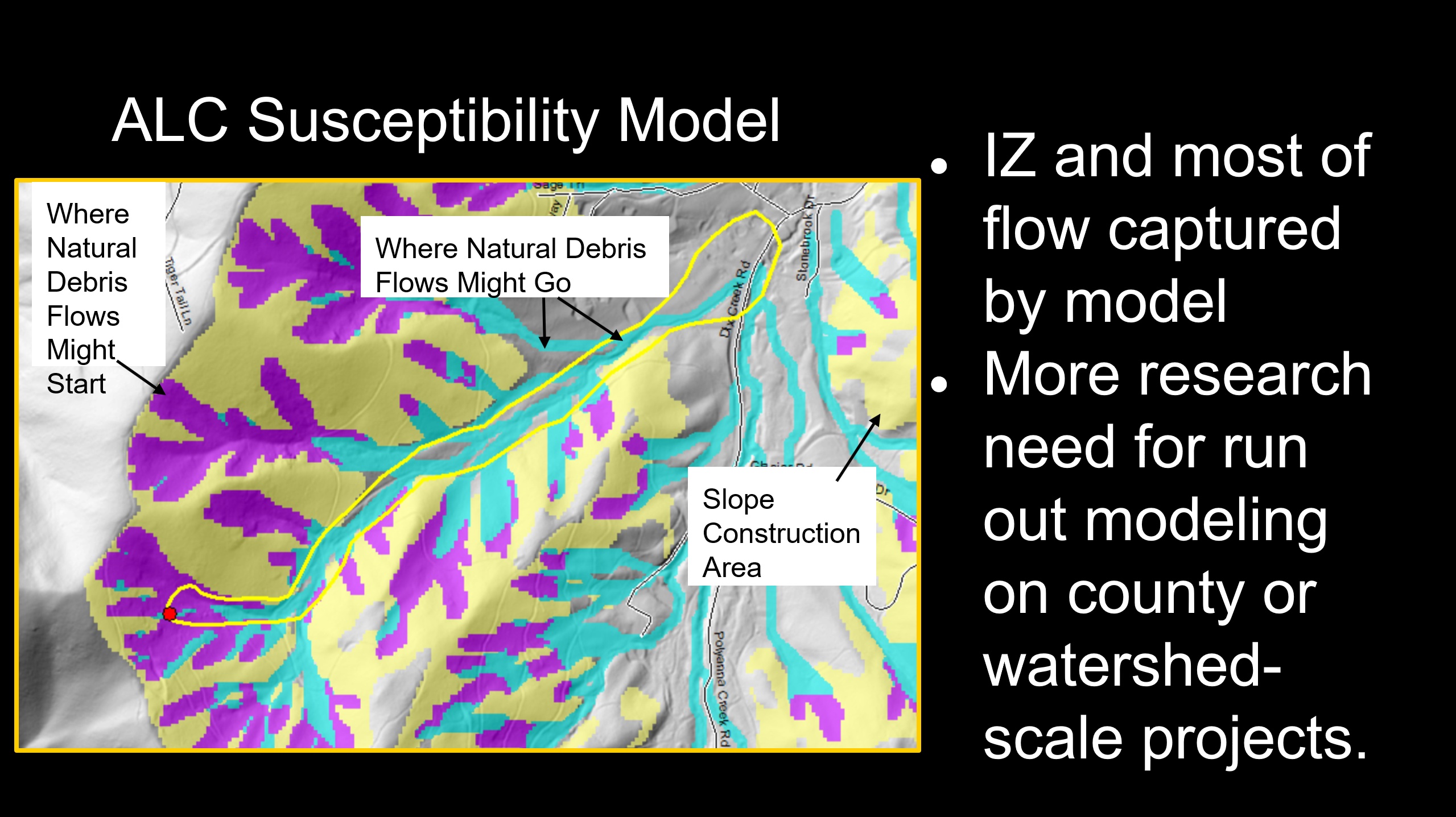 Improving understanding of where debris flows will go as they move downslope–and how wide they may be–will be a focal point of landslide research in coming years. The teal color shows existing modeling of a debris flow path; the yellow outline shows the actual extent of the affected area.