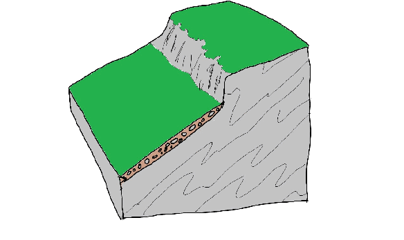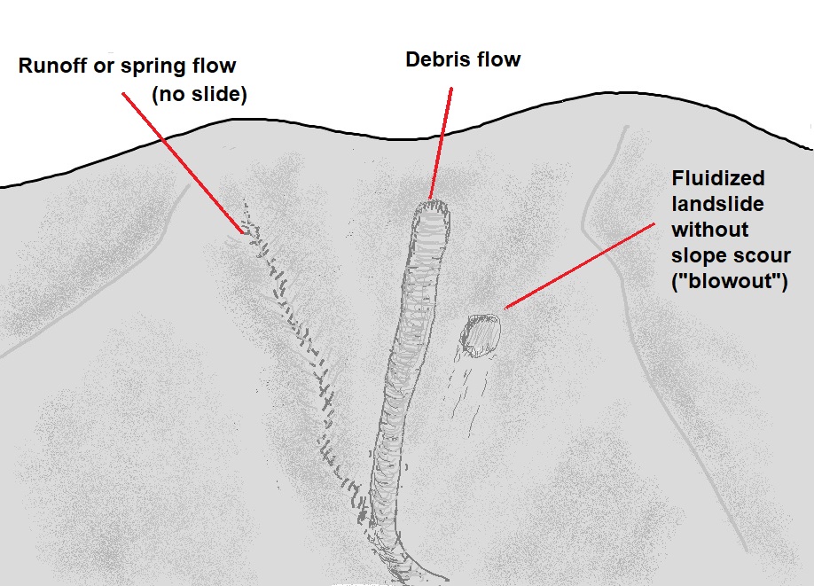 Within the grayscale world of lidar-derived hillshade imagery, debris flow scars can be distinguished from small, water-carved channels due to the effects of the initial sliding and subsequent scouring processes. Fluidized landslides similar to debris flows, but without the long, scoured track (referred to as “blowouts”), also produce distinct scars. The sketch below offers a basic summary of what you’re after as you peruse lidar imagery.