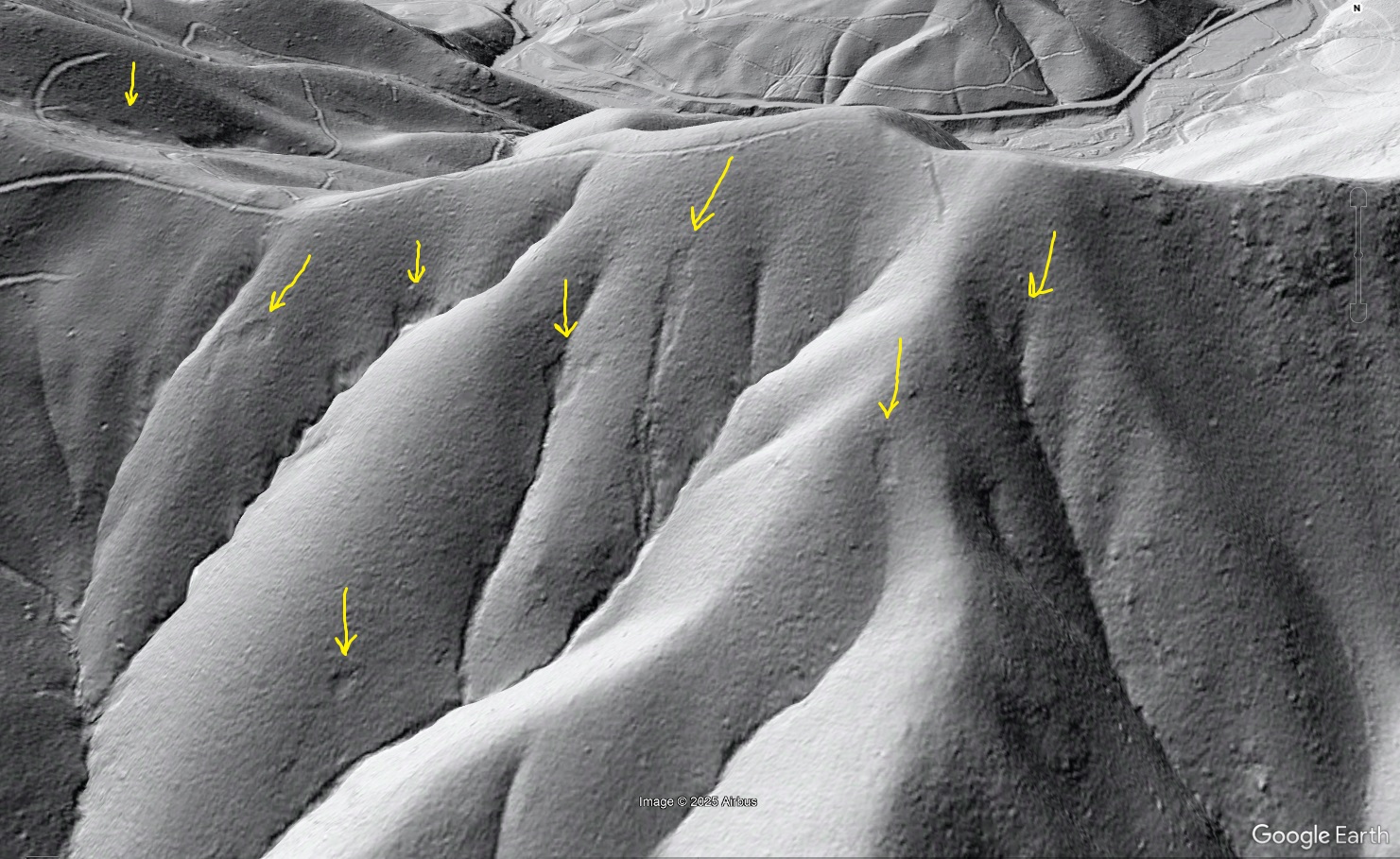 There are indeed an impressive number of debris flow scars on Fires Creek Mountain at the top end of the black line, exactly where they should be. Their appearance is unmistakable, and they distinctly cluster within a limited area as Clingman notes in his report. Yellow arrows point them out below; many more are visible in the zoomed-out view that follows. They aren’t labeled in the large view–see how many you can find.