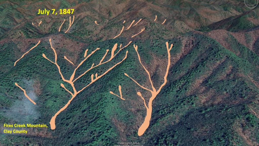 Seeing the results of past extreme storms in a region is an important part of understanding potential landscape behavior. Thomas L. Clingman (yes, that Clingman) provides an invaluable record of a couple of past storm events in his extensive writings about western North Carolina. His discussion of the results of a storm of July 7th, 1847, in Clay County is particularly interesting. The document is linked here, but the excerpt below contains the important parts found on page 76 of the document. Anyone that saw the effects of a Helene debris flow will quickly recognize exactly what Silas McDowell described to Clingman.