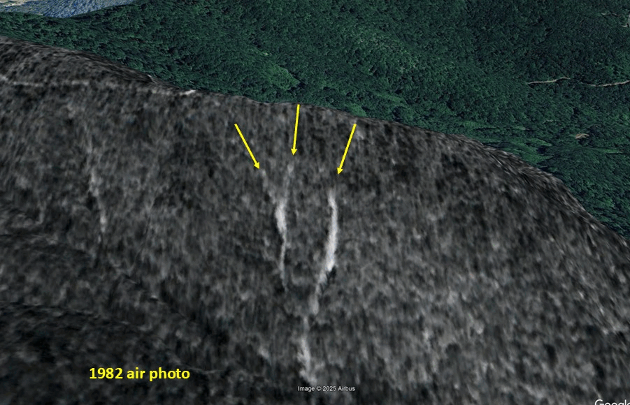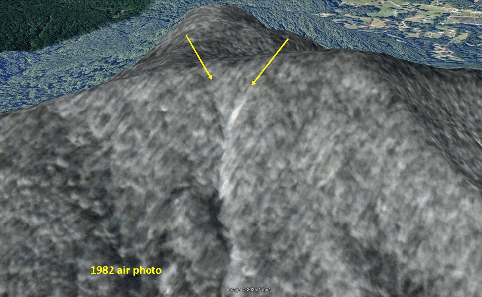 This 1847 storm was likely an isolated storm “stuck” on the mountain ridges, given the limited size of the most intense debris flow activity. Clingman references observers in the valley below watching the storm on the mountain but not experiencing the intense precipitation themselves. Had this storm happened today (or in the era of easy photography, particularly aerial photography), it would have been intensely documented and firmly cemented in local lore. Today, it might make international headlines, particularly if someone caught a video of one of the debris flows reaching the valleys. How readily visible the debris flows and blowouts were from the valley below in 1847 is hard to know, but it was obviously eye-catching enough to have attracted attention and investigation from locals at the time. The images below show brown outlines over the visible features.