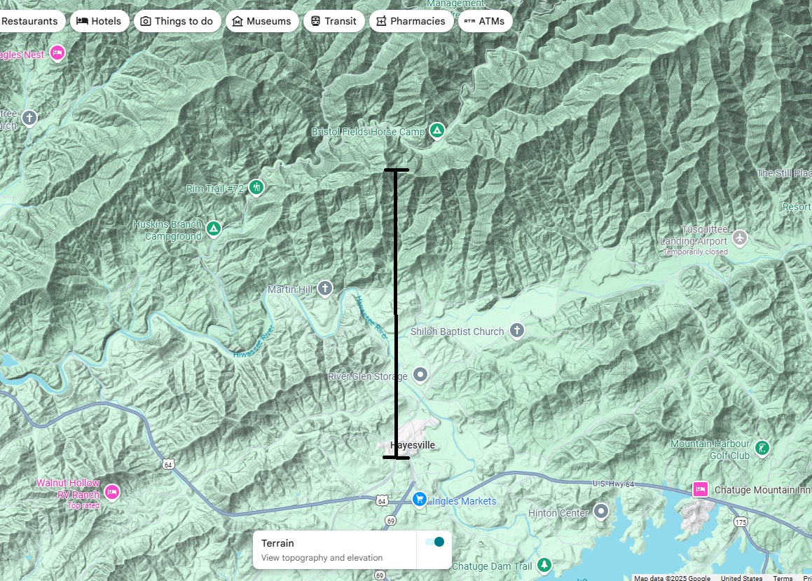 So, with this knowledge in mind, it’s time to take a look at Fires Creek Mountain. Clingman’s geography and distance estimates are always excellent, so I drew a line four miles due north from the Fort Hembree historical marker’s general area. The line met the top of Fires Creek Mountain at about 3.9 miles in a debris flow-susceptible area…not bad. The lidar imagery does the rest.