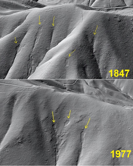 If you want to go looking for 180 year old debris flows, you need to know what sort of scars you might be looking for on mountainsides. An effective way to do this is to examine the lidar-visible scars of known debris flow events. The November 1977 storm produced quite a few debris flows southwest of Asheville in the Bent Creek area. These were captured in 1982 aerial photography when their scars were still visible in the forested landscape. These air photos can be matched to lidar imagery to directly confirm what debris flow scars look like in the landscape. The GIFs below show this process, with yellow arrows indicating the upslope starting points (initiation zones) of the debris flows.