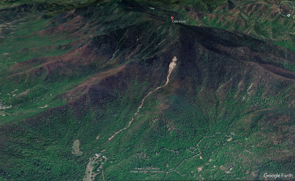 Interestingly, the Garden and Gun article inadvertently showcases another notable Helene event: the Celo Knob debris flow, which might have left the largest single scar (in terms of surface area) of any debris flow during the storm. The scar is visible in the background of the image below, which is from the article.