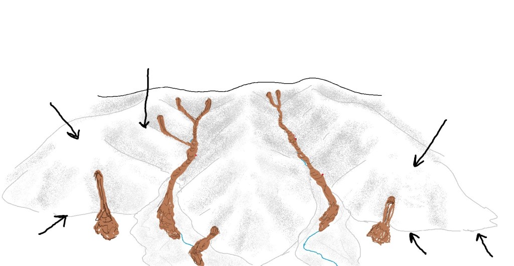 Fortunately, the client heeded ALC’s recommendation and purchased well-situated property in Yancey County, which avoided damage due to its position within the landscape despite Helene’s catastrophic impacts in Yancey. The hazard potential on both the selected Yancey property and the Middle Fork property were evaluated remotely–simply looking at detailed topographic maps, lidar imagery, and records of past debris flow events painted a clear picture to geologists with years of experience in the region. In this case, the return on investment in the evaluation was quite significant, with the client able to avoid a major loss and instead devote resources towards a property in a more stable and resilient location. The fundamental concept behind this type of evaluation is being able to read the landscape shape and history and visualize impact potential. The images below illustrate the concept. Black arrows show locations where convex slopes (and often elevation) steer debris flow and flood hazard away; red X’s are in areas to which debris flow and flood hazards are directed by landscape shape.