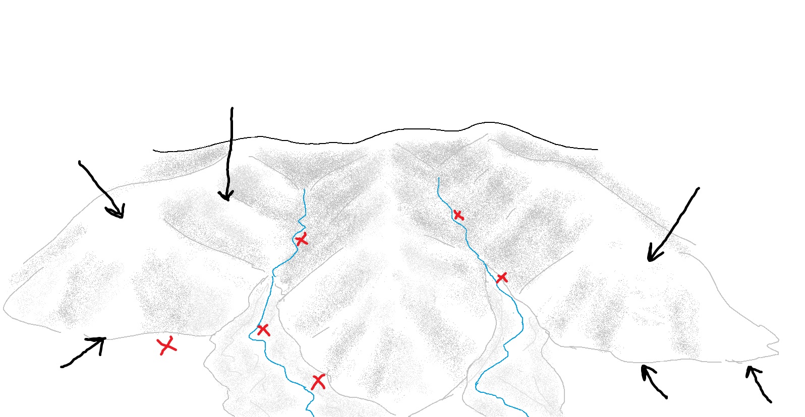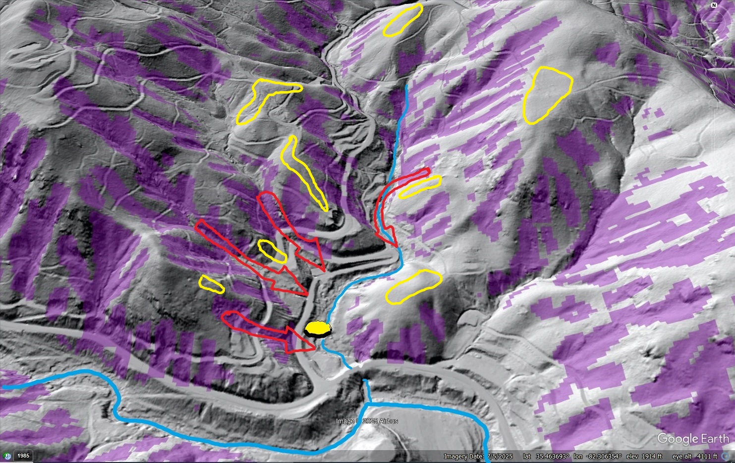 Fortunately, the client heeded ALC’s recommendation and purchased well-situated property in Yancey County, which avoided damage due to its position within the landscape despite Helene’s catastrophic impacts in Yancey. The hazard potential on both the selected Yancey property and the Middle Fork property were evaluated remotely–simply looking at detailed topographic maps, lidar imagery, and records of past debris flow events painted a clear picture to geologists with years of experience in the region. In this case, the return on investment in the evaluation was quite significant, with the client able to avoid a major loss and instead devote resources towards a property in a more stable and resilient location. The fundamental concept behind this type of evaluation is being able to read the landscape shape and history and visualize impact potential. The images below illustrate the concept. Black arrows show locations where convex slopes (and often elevation) steer debris flow and flood hazard away; red X’s are in areas to which debris flow and flood hazards are directed by landscape shape.