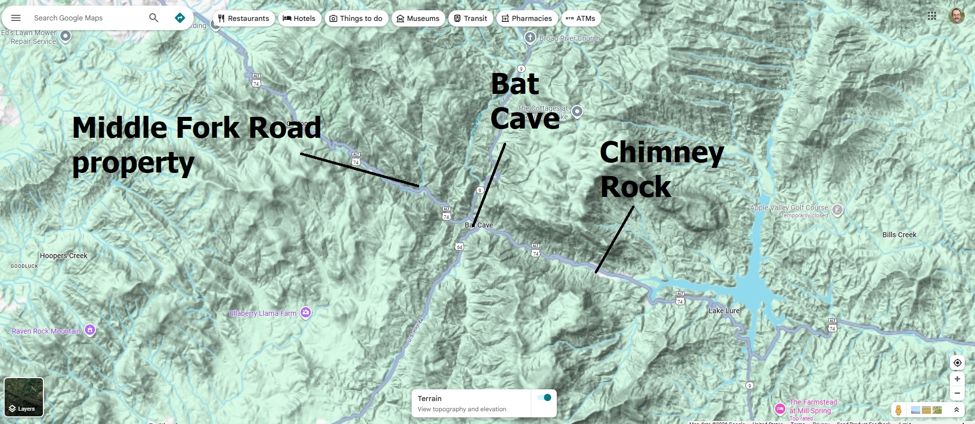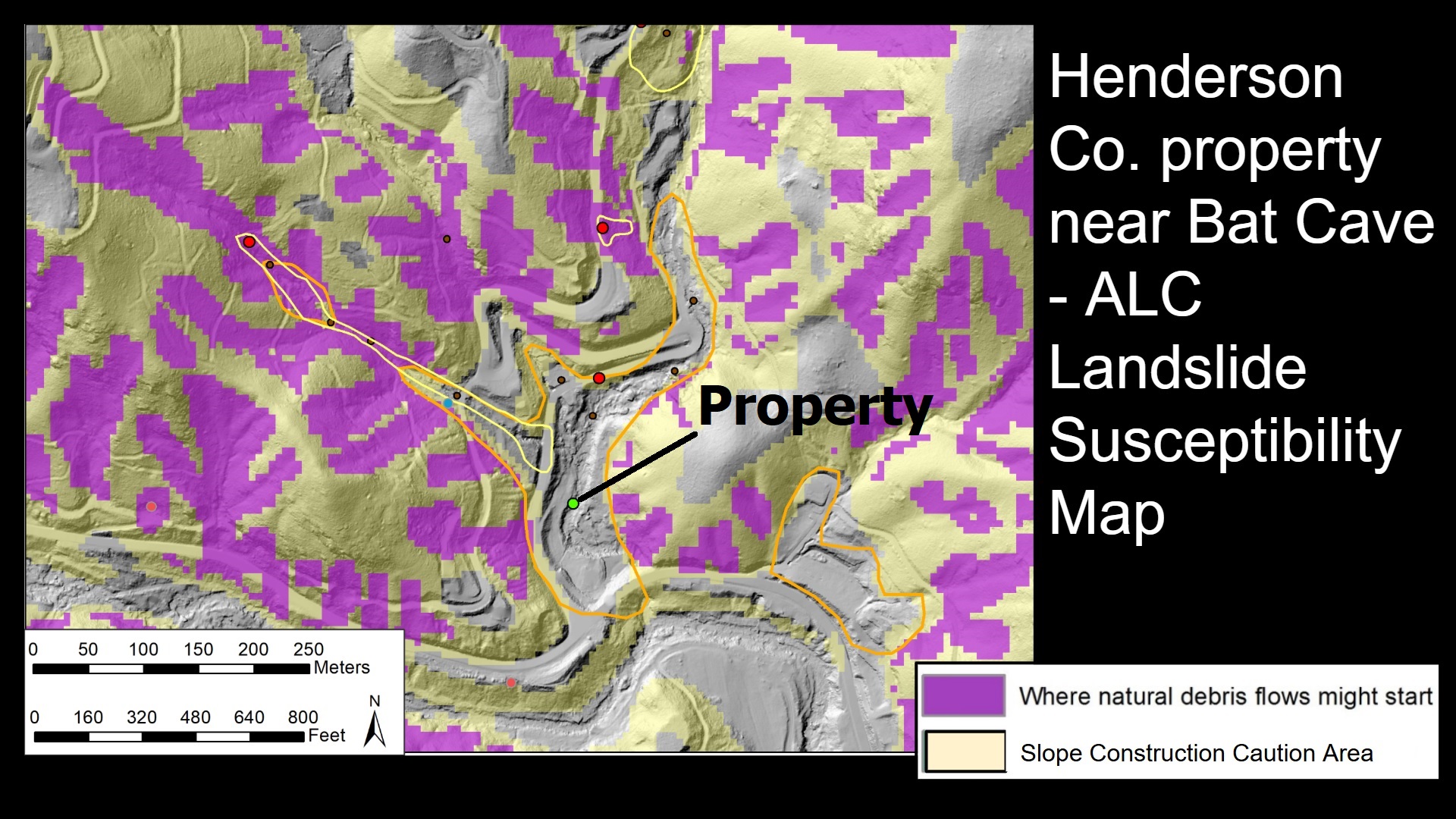 Landslides (and particularly debris flows) aren’t a daily occurrence in western North Carolina, so knowledge of the landslide risk of a specific property may not always seem important. A few years ago, ALC advised a client against purchase of a high-risk property located in an area that, at the time, seemed quite safe and desirable for a mountain home. The risk potential of the property turned into devastating reality during Helene, and a significant loss was avoided thanks to the pre-purchase site evaluation and subsequent decision to buy and build elsewhere. The locations and images of the impacted property are described in this post with the client’s permission. Her experience is noted in a Garden and Gun article linked here.