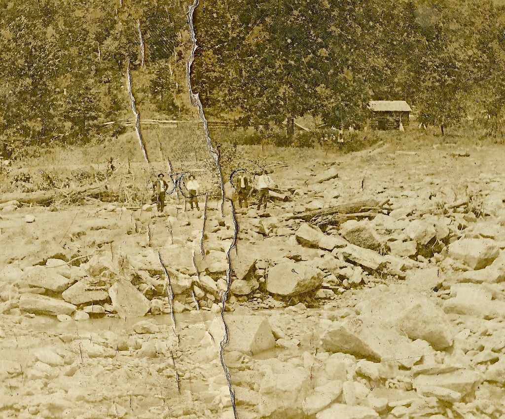 The 1/2 mile length appears to match the end of the braided channel and obvious boulder deposition fairly well, though a large amount of finer sediment likely continued downstream, mixed with floodwater. The lidar image below shows a detail of the bouldery ground surface, and the incredible 1916 photo, courtesy of Ann Loudermilk via Jule Hubbard, shows what the Jacks Branch aftermath looked like.