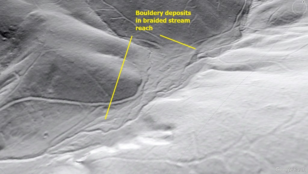 Below the scoured section, Jacks Branch has an almost braided appearance, with deposited boulders visible in 1-meter lidar imagery. The GIF below superimposes a 1/2 mile debris flow runout onto the lidar imagery, per description of the aftermath of the event recorded in 1916.
