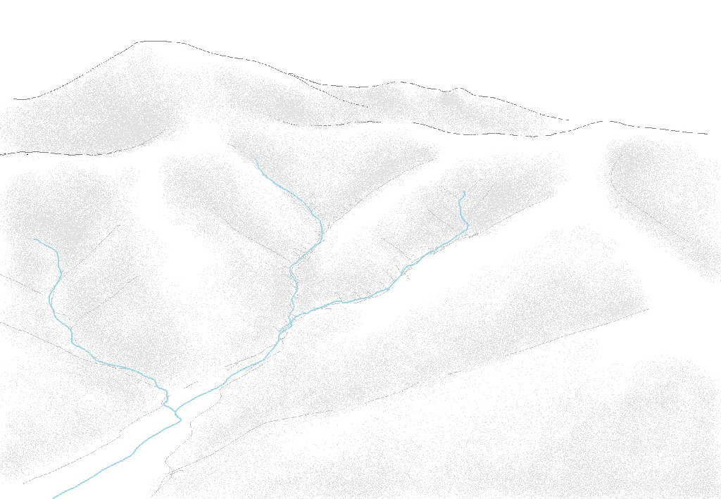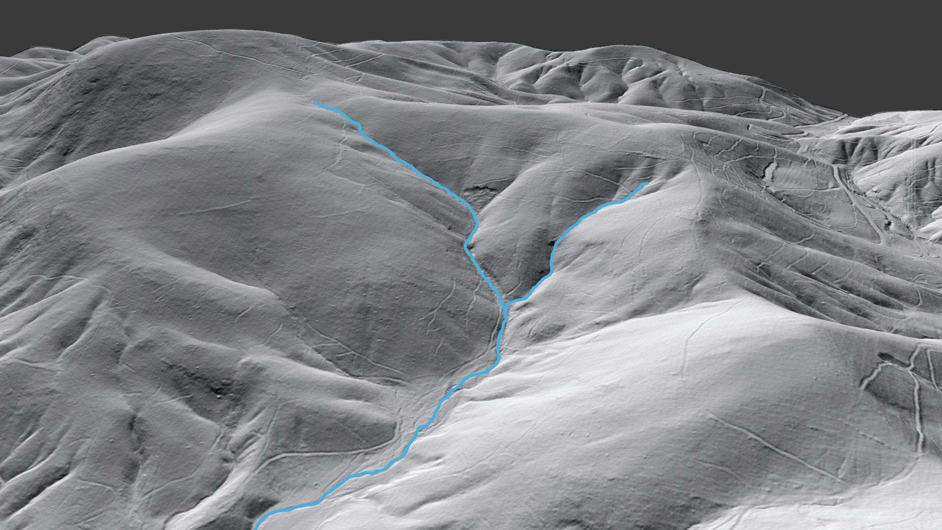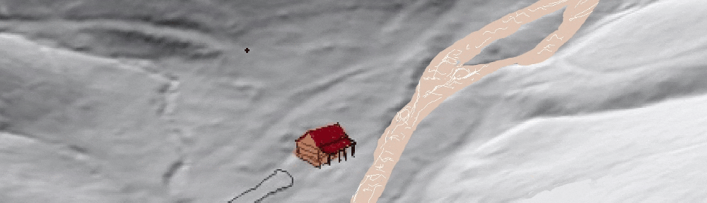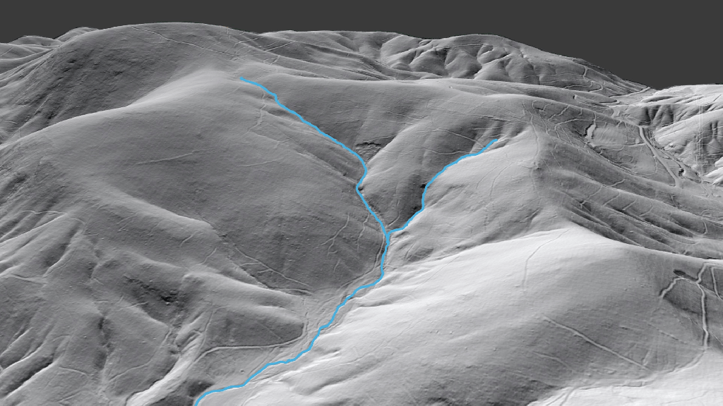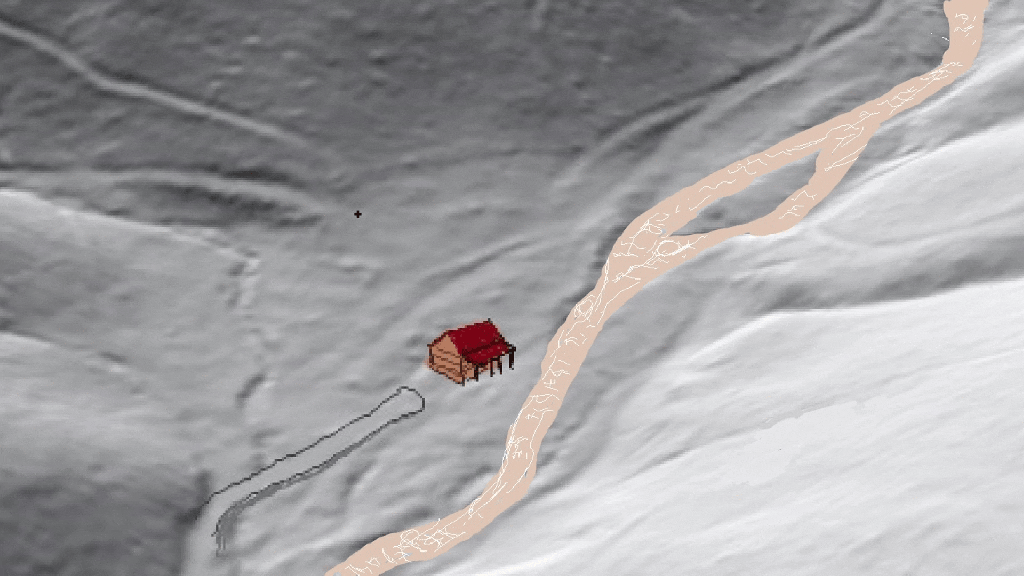 Locating this debris flow with lidar was initially a bit of a challenge due to the overall shape of the topography and atypical position of the initiating landslide. The scour of the Jacks Branch channel was the most useful identifier, whereas many debris flows of the higher Blue Ridge are first picked out by their initiating landslides within colluvial hollows. In the case of Jacks Branch, as with nearly all Appalachian debris flows, an initiating landslide triggers loading and liquefying of the saturated soil and rock debris along the channel downstream (more on this later). This “feedback” process produced an ever-growing mass of liquefied soil, rock, and trees, scouring the channel and delivering a huge amount of debris to the valley below. This GIF offers a conceptual animation of the process, along with the appearance of the aged and weathered track and deposit as it is seen in lidar imagery today.