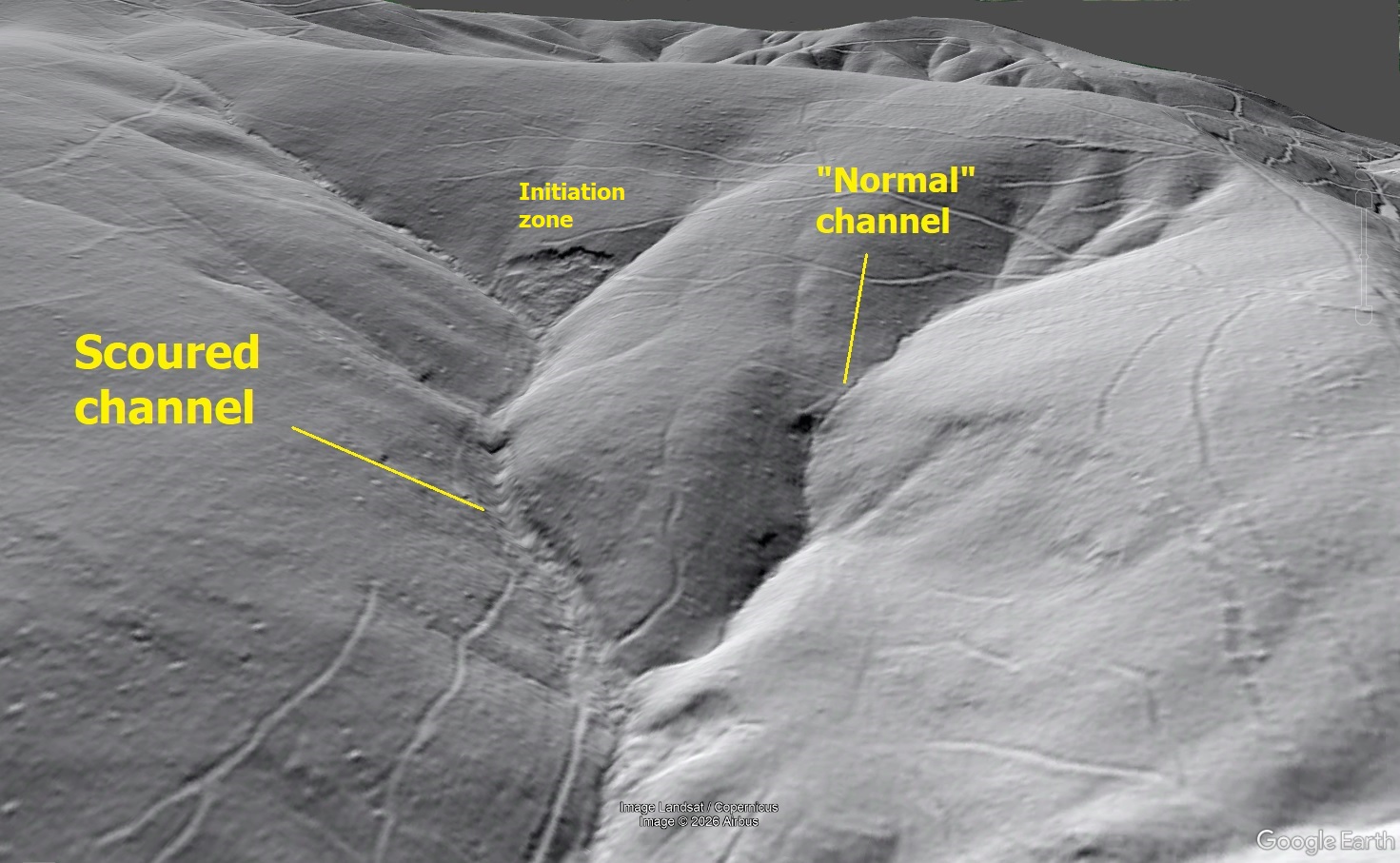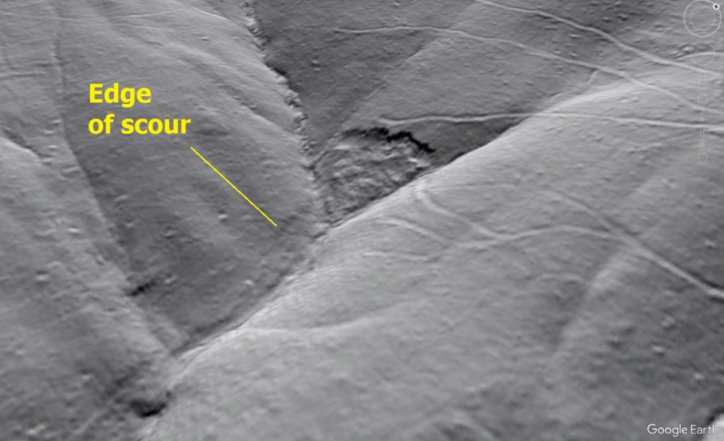 Scour can be seen cutting across the toe of the slope immediately below the initiating landslide.