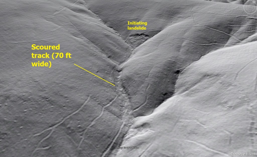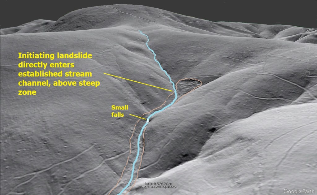 The Jacks Branch debris flow track remains clearly visible today, with significant scour occurring along a steep portion of Jacks Branch just below the initiating landslide.