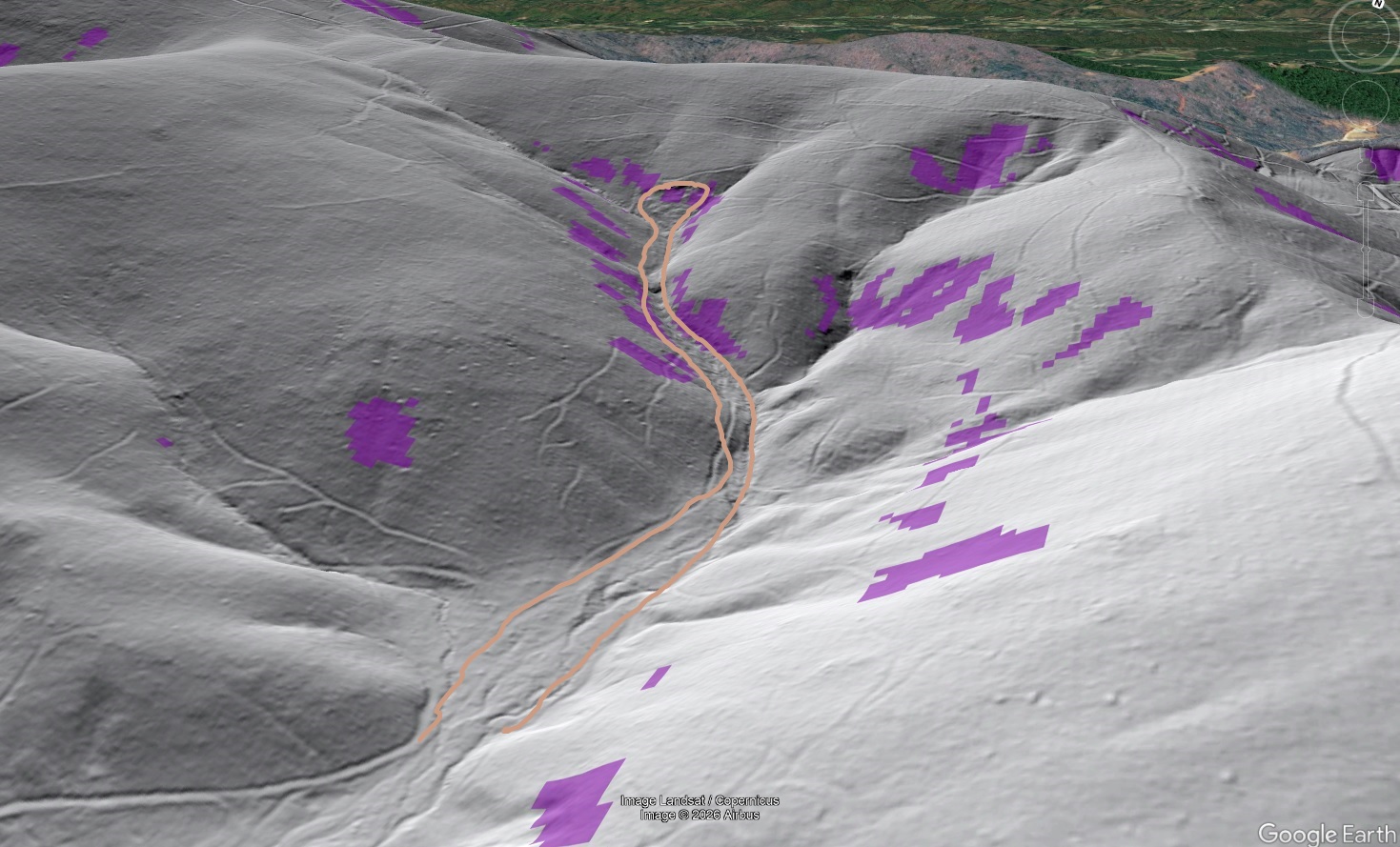 One detail that is lost to history (and can’t be answered from lidar imagery) is where the Russell cabin was located. One of Jule’s sources indicated that the cabin was located “on the mountain,” and not in the defined flat valley below. Somewhere near the confluence of the streams near bottom center of the image above is likely a reasonable location. The Russells obviously were not thinking about debris flows when they built or first occupied their cabin, and Jacks Branch or its tributary probably seemed too small to ever present a flood risk. I superimposed ALC’s Susceptibility onto the Jacks Branch area to see what we might say about building in this landscape today, given its distinctions from the high Blue Ridge. Areas where debris flows could potentially initiate (purple) do occur through the Jacks Branch basin, though in a somewhat different pattern from more rugged Blue Ridge landscapes. The Jacks Branch debris flow is outlined in brown.