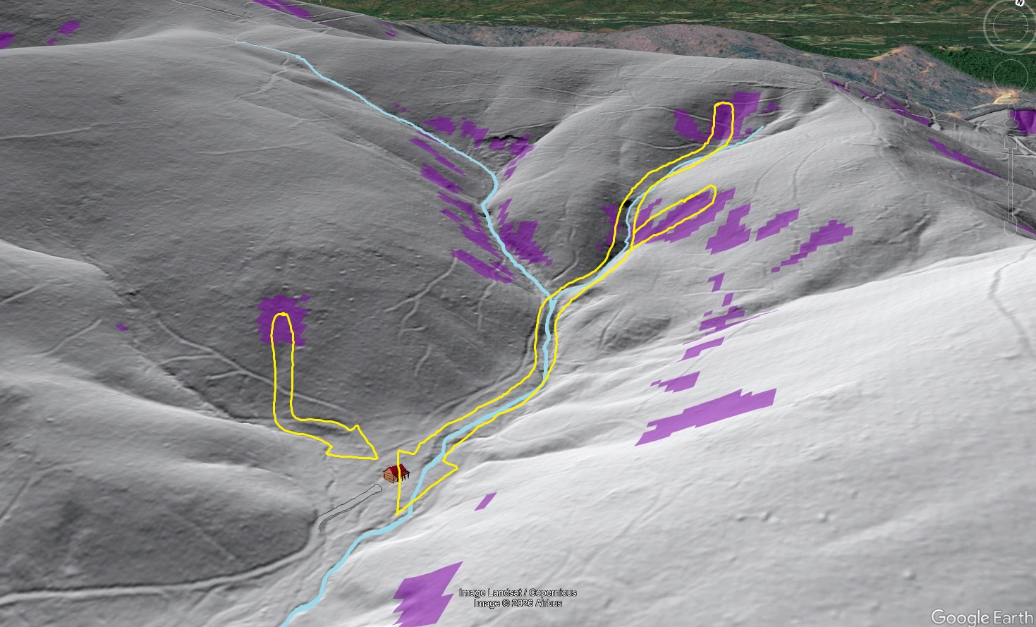 While this drainage basin is significantly less purple than many we look at, hazard areas are present, and debris flows initiating in them would follow the locally quite steep channels to the valley below. My pick for hazard the area shown above would be east (to the right of) Jacks Branch, in the steep, high hollows of the Jacks Branch tributary. A debris flow initiating there would ultimately end up in the same place as the 1916 debris flow, on the flat, deposit-filled valley below. While the flat valley area represents attractive, buildable topography that feels protected by the mountains, it’s quite vulnerable to debris flows during extreme weather conditions. The yellow arrows below show only a few of the possible debris flow pathways.