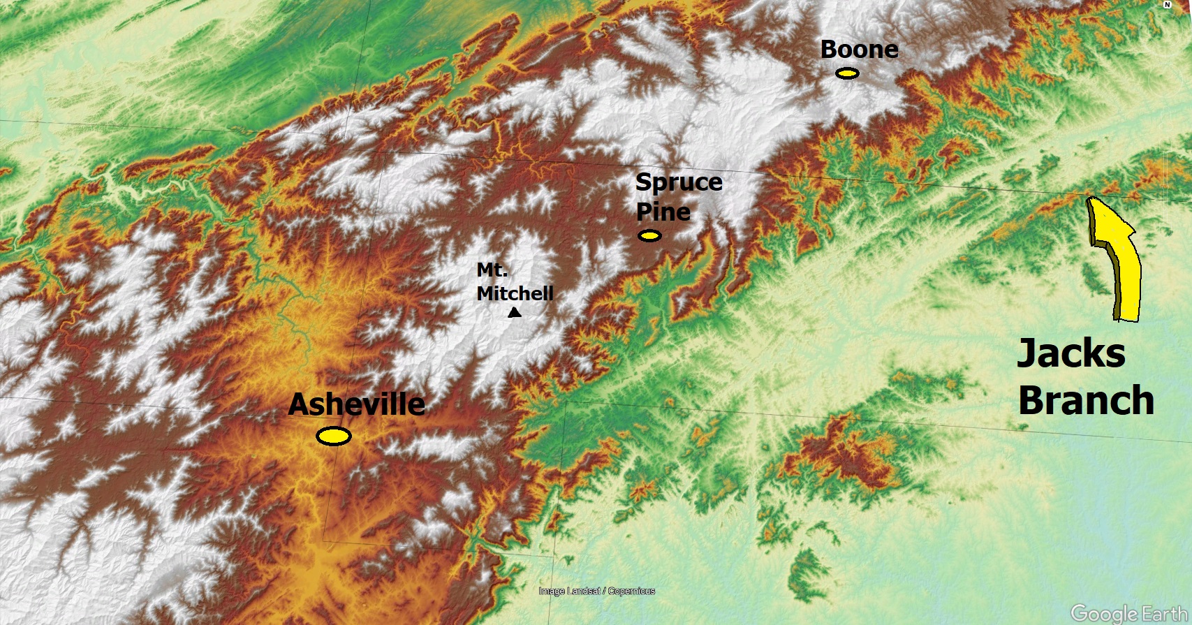 The Jacks Branch story is a valuable piece of history and an important lesson about steep slopes and extreme storms in the region. Huge mountains aren’t necessary for big landslide issues, particularly when rainfall and widespread soil saturation is sufficient to trigger debris flows. Debris flows tend to occupy MUCH larger widths than even the worst floods on the small streams they follow, leading to unbelievable aftermaths that suggest an impossibly huge “river of mud of rocks” suddenly appeared in a tiny valley. Linney’s account in the linked article communicates this idea very clearly. Avoiding the worst-case water flood on a small mountain stream isn’t enough if debris flow-prone topography is upstream.