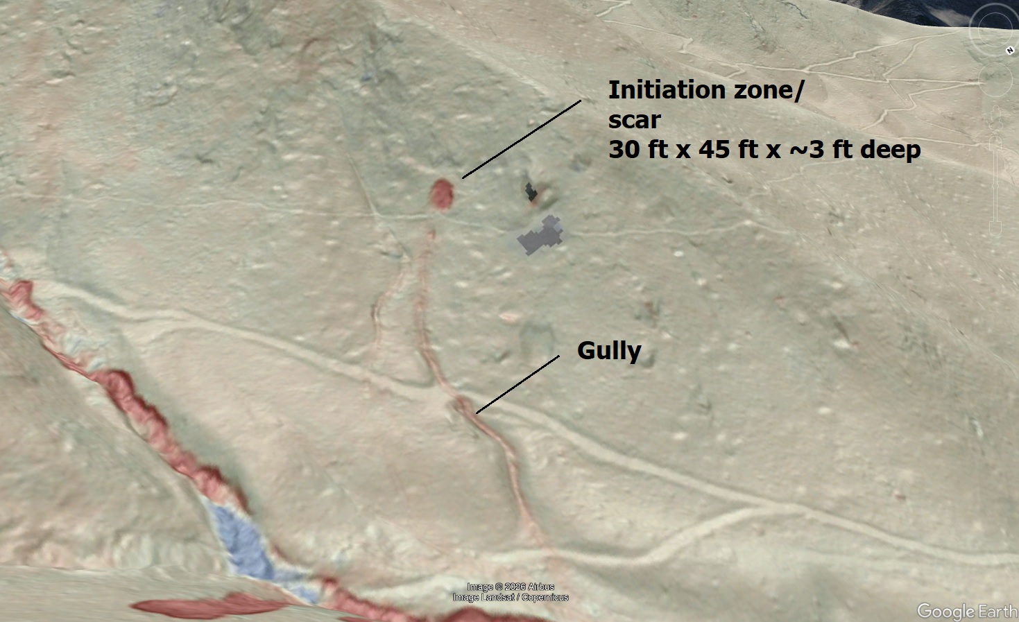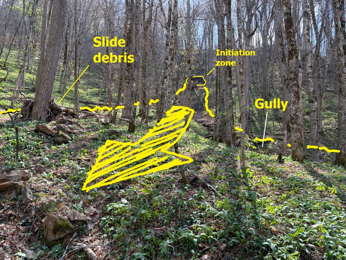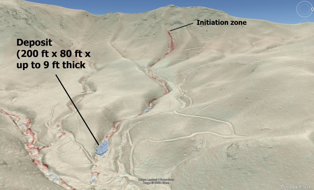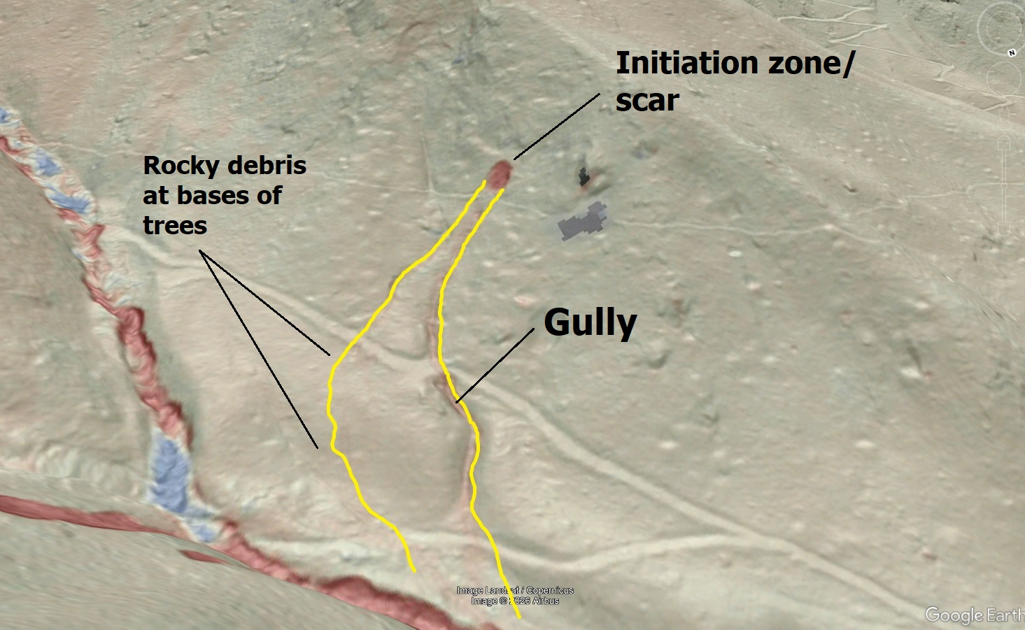 Looking back up at the initiation zone of the slide, the overland travel of the slide debris is impressive. The deposits shown above are just off the left edge of the image below. The wavy yellow lines indicate the approximate limits of the area over which slide debris moved. Notably, the volume and momentum of the fluidized debris kept it from following the gully, allowing it to wash over a broader area of the slope.