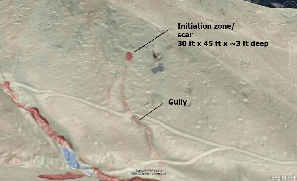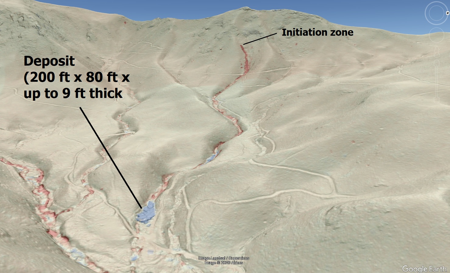 On the lidar change imagery, the affected area would something like what is outlined below. While the affected area looks quite large for the size of the initiation zone/scar, it seems typical of observed behavior of fluidized slides on more open slopes in the area.