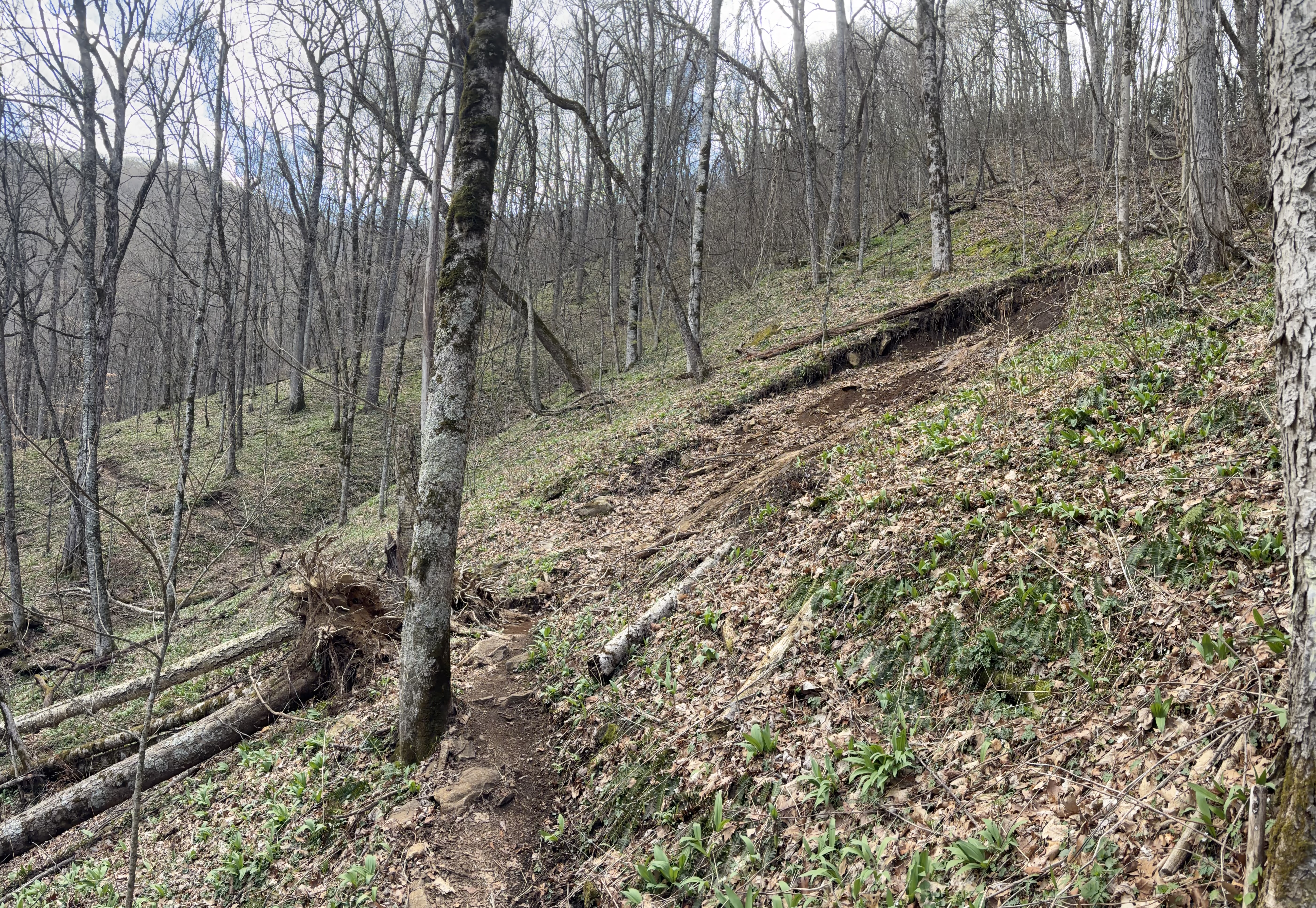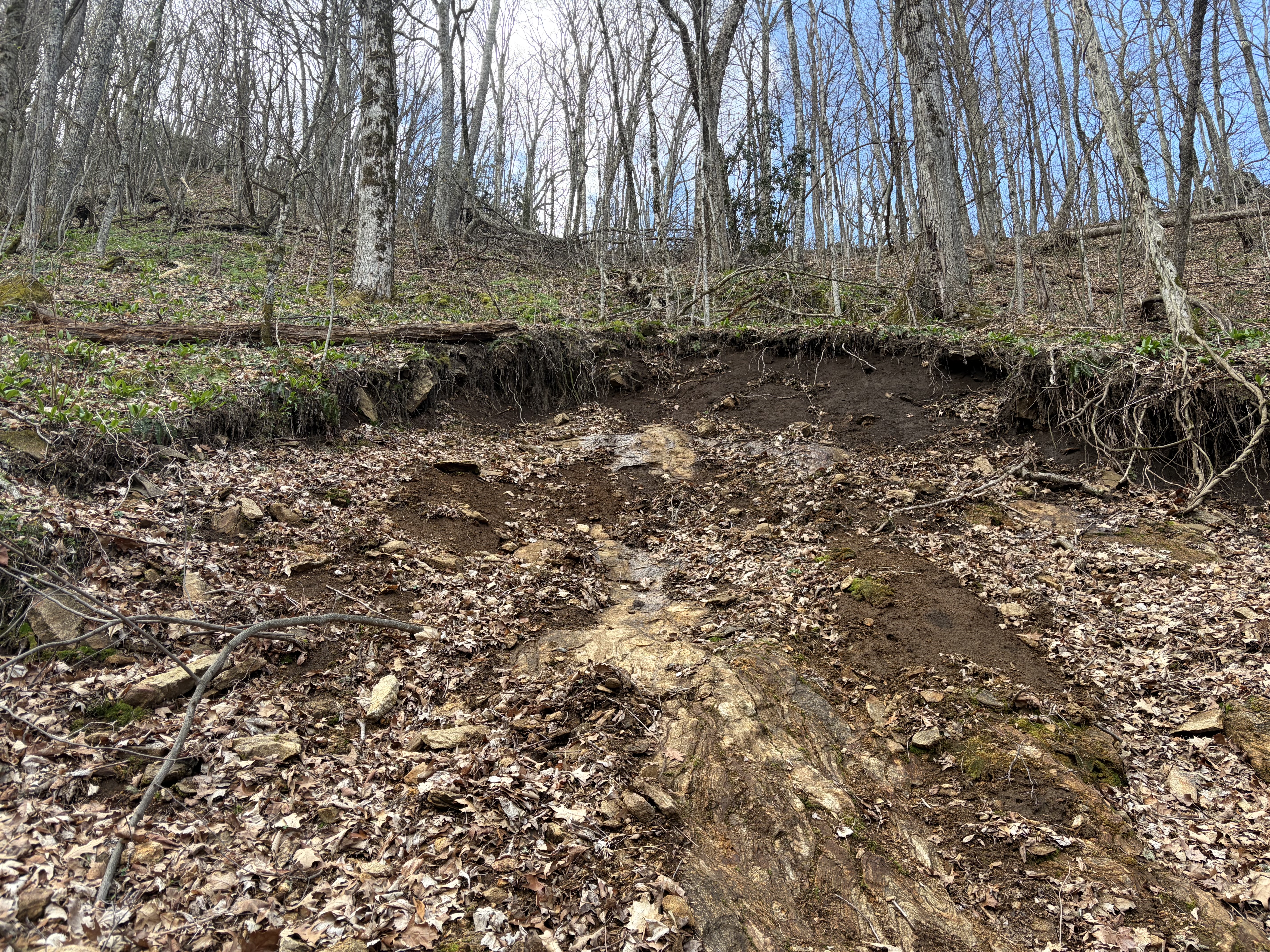 This slide left no visible deposit or significant scour on the slope. Some of the fluidized soil would have followed the gully downslope, but a slide of this size could easily overwhelm such a small gully. The slope below the slide is generally intact, with understory plants growing and no clear zone of soil loss due to passage of the fluidized slide over the land. The images below show the slide scar and the view downslope. The Art Loeb trail passes just below the base of the scar (really fine line below the slide in the image above), offering easy access! The details of the slide scar are also worth a look. Colluvial soil with a distinctly dark matrix (common in this area/elevation) failed at the bedrock-colluvium contact. The contact zone was damp and seeping on the day of the visit, despite a period of dry weather.