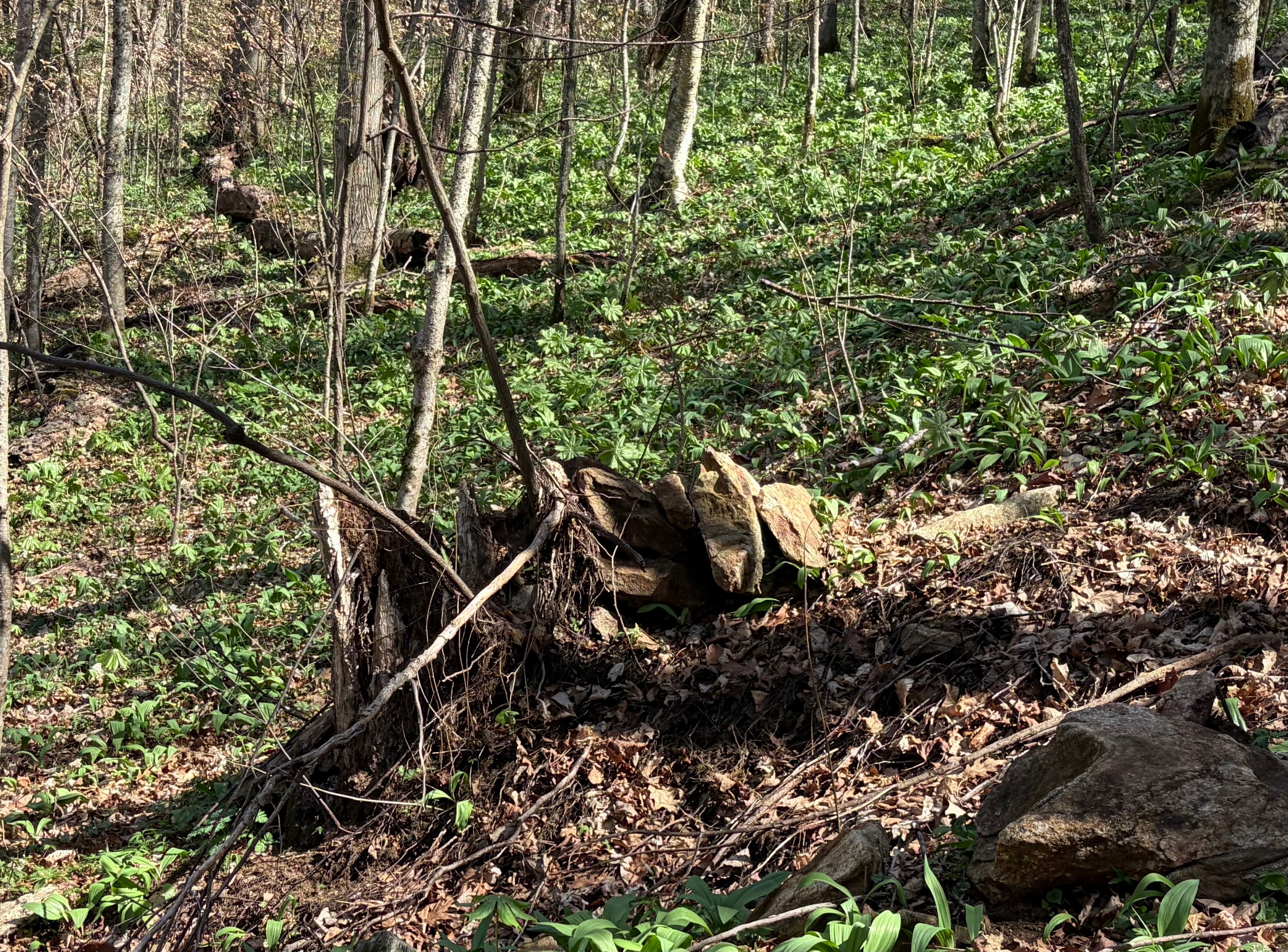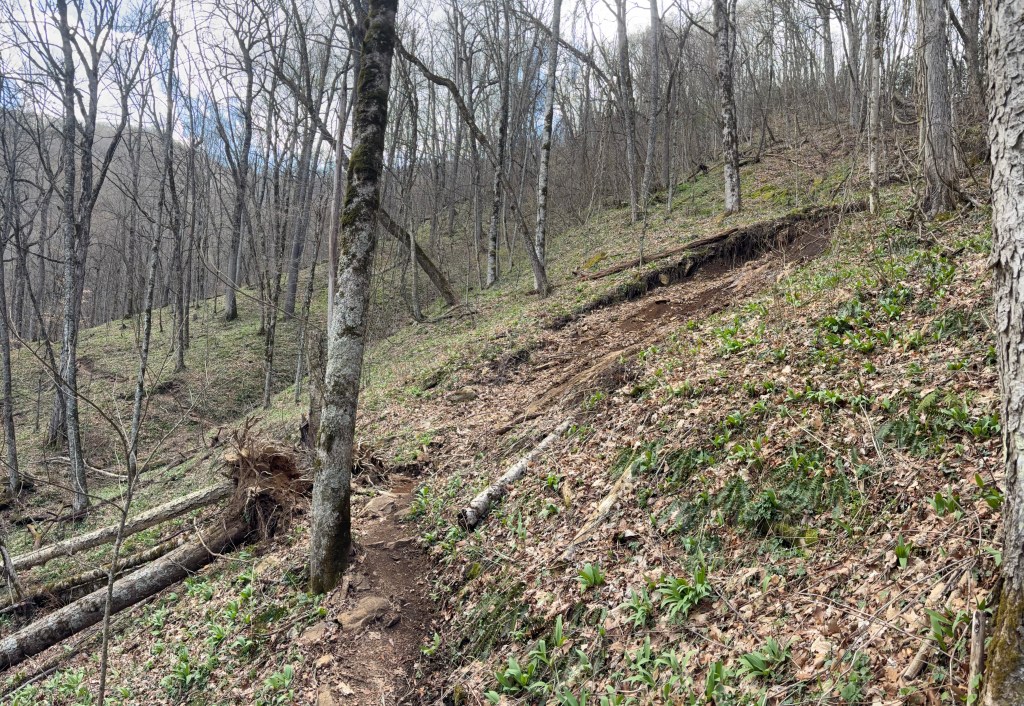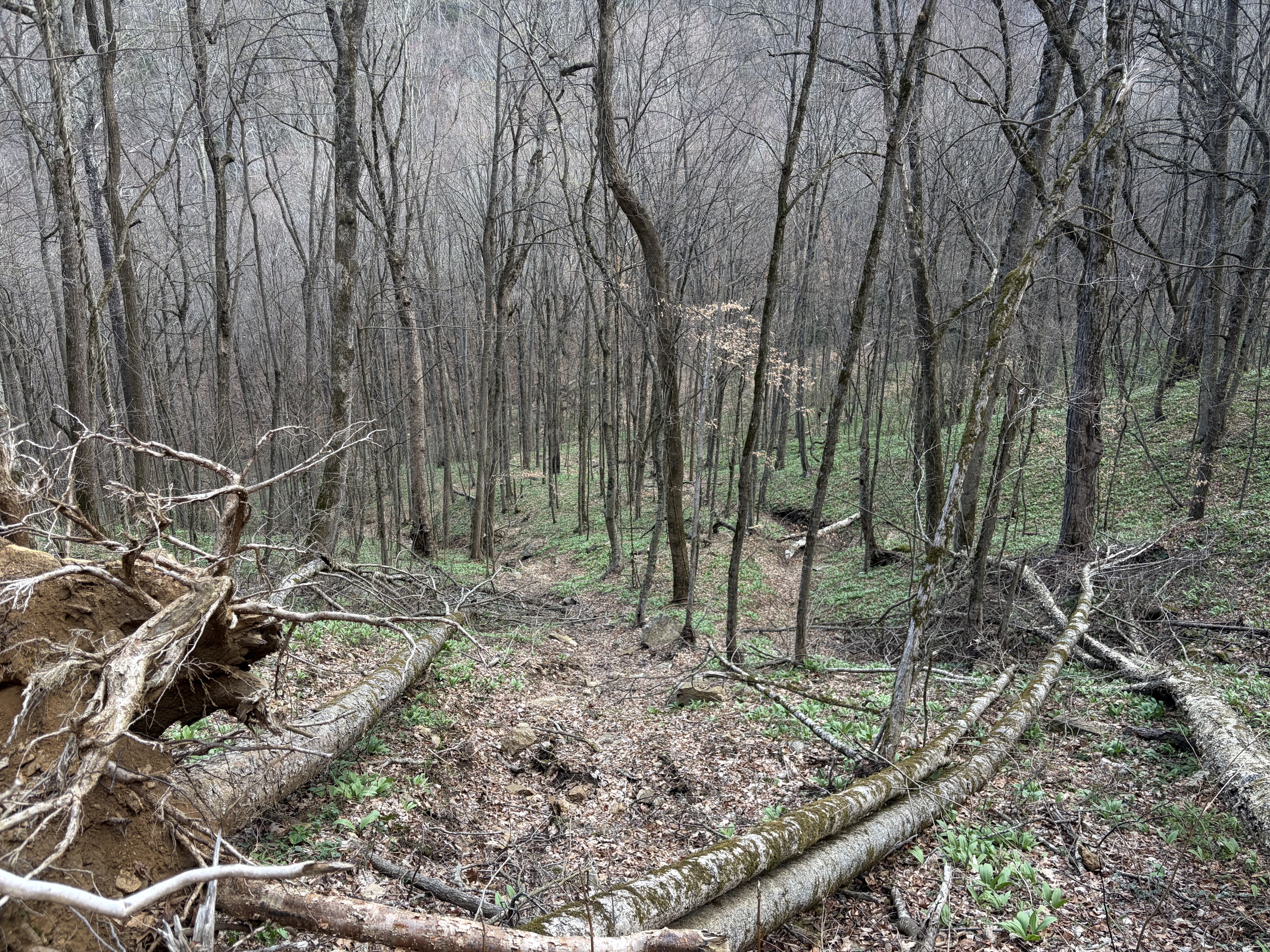 Unfortunately, not all slides are this easy to interpret from LiDAR imagery, making field work necessary to better understand a slide’s movement and potential impact area. Just over the ridge from the slide above, a small but significant Helene landslide left a scar on the slope but little additional information about where the fluidized slide material went. In a situation like this, field work is still necessary to really understand what happened. Even though this is a relatively small feature, slides like it caused massive damage to structures during Helene, so understanding its material movement has real-world value. Though it’s hard to visualize, this slide released a few dumptruck loads of fluidized soil and rock at once, so we definitely still care about these smaller failures and where they go!