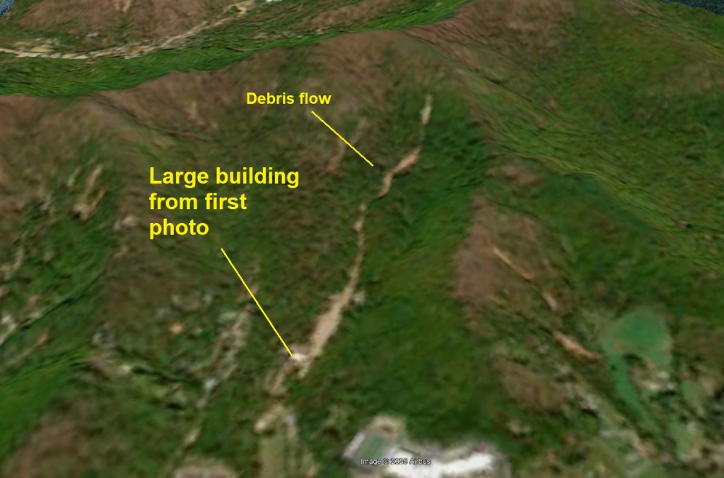 Debris flows like these begin as an initial landslide, producing a distinct scar in the landscape with steep, sharp edges where the slide began. This scar transitions into a visibly scoured track where the debris flow rakes saturated soil from the slope in its path, adding to the flow’s mass. The GIF below gives a general idea of this starting process and the scar that it makes, from the initial slide to the early phases of scour.