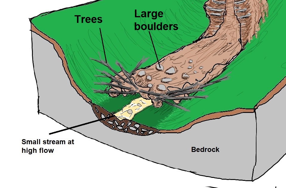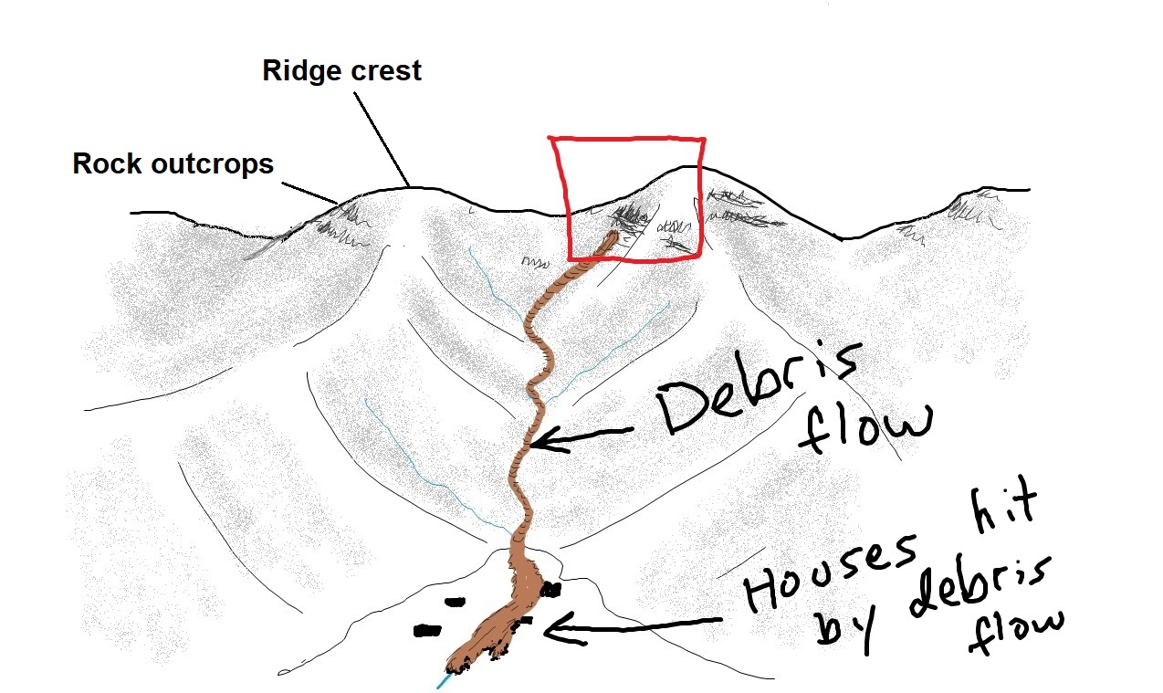 Within the grayscale world of lidar-derived hillshade imagery, debris flow scars can be distinguished from small, water-carved channels due to the effects of the initial sliding and subsequent scouring processes. Fluidized landslides similar to debris flows, but without the long, scoured track (referred to as “blowouts”), also produce distinct scars. The sketch below offers a basic summary of what you’re after as you peruse lidar imagery.