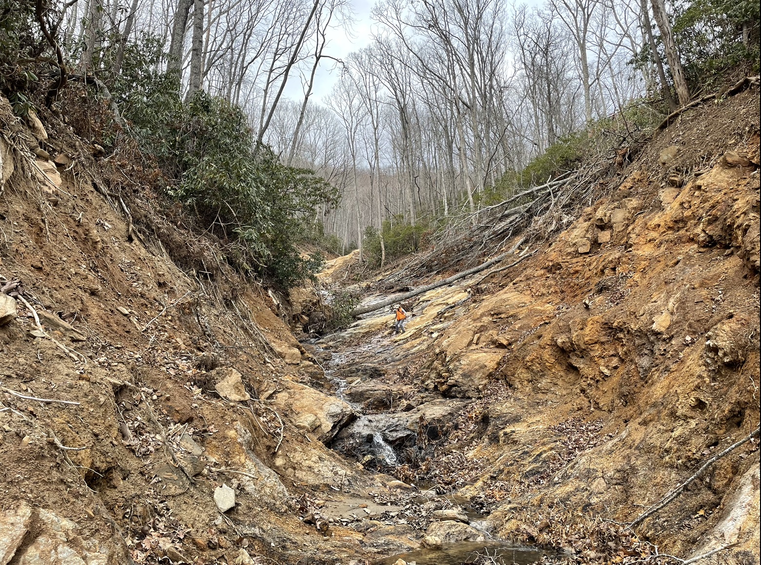 So, with this knowledge in mind, it’s time to take a look at Fires Creek Mountain. Clingman’s geography and distance estimates are always excellent, so I drew a line four miles due north from the Fort Hembree historical marker’s general area. The line met the top of Fires Creek Mountain at about 3.9 miles in a debris flow-susceptible area…not bad. The lidar imagery does the rest.